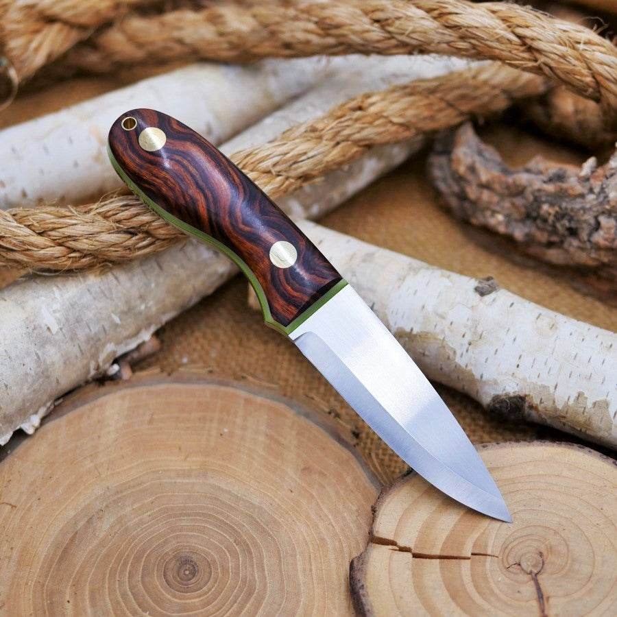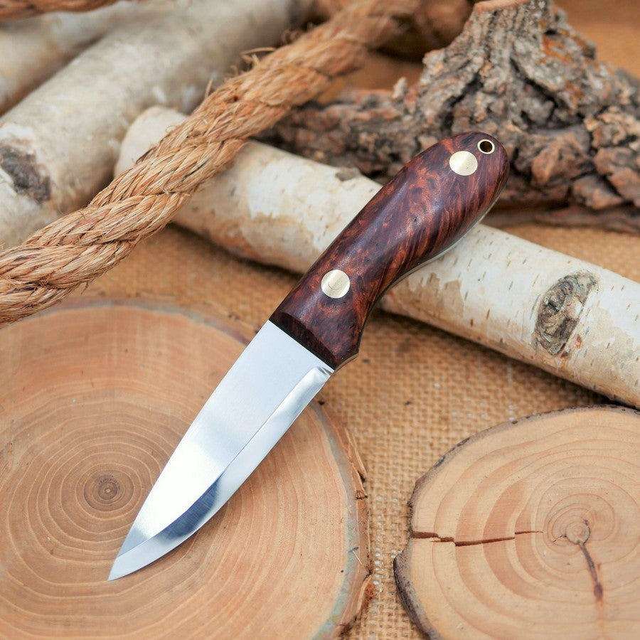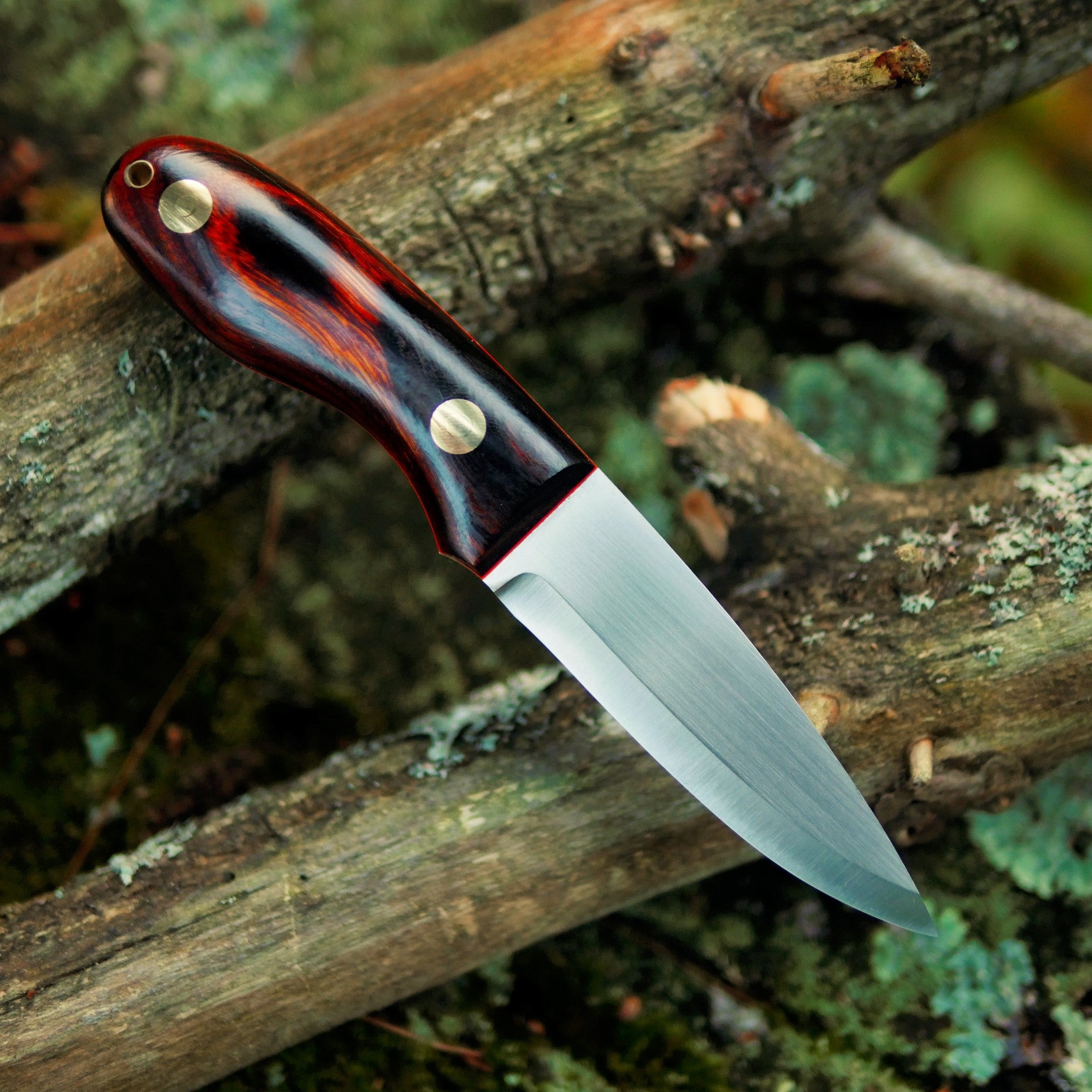 The Walker is a compact bushcraft knife. Its blade has a 3" cutting edge and a drop-spearpoint shape, allowing for excellent control and detail in woodcarving tasks. The stout blade can handle batonning of logs up to wrist-thickness. Designed to be comfortable in any grip, the Walker's short handle and teardrop contour fills the hand very well, allowing switching grips to feel effortless. The Walker may serve as the lightweight bushcrafter's sole cutting tool, or pairs perfectly with an axe or larger knife.