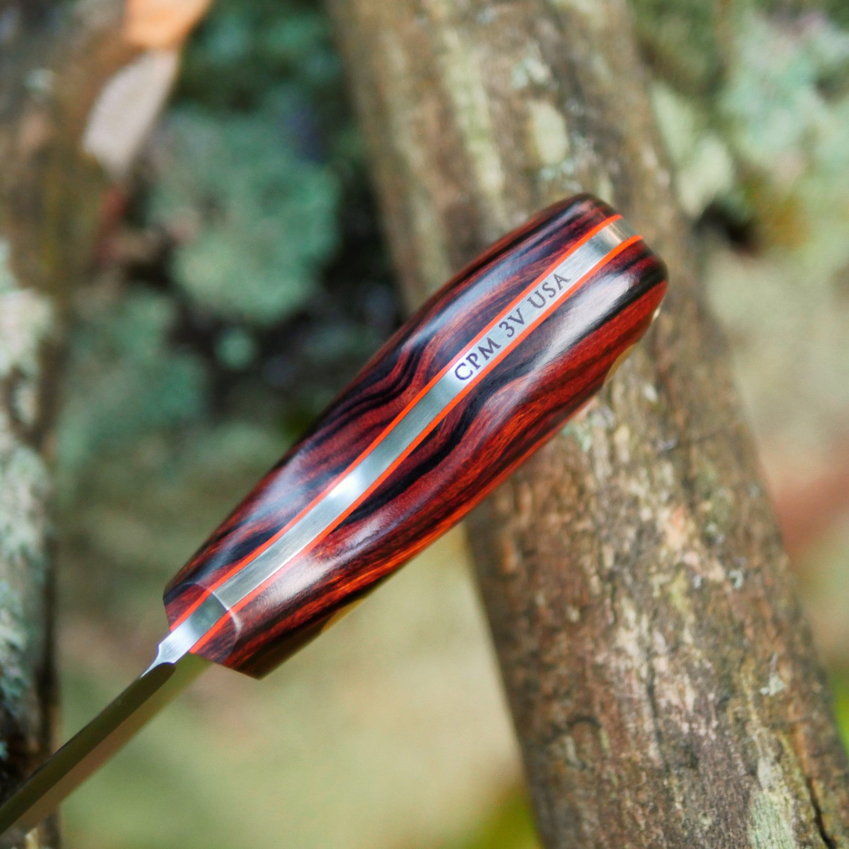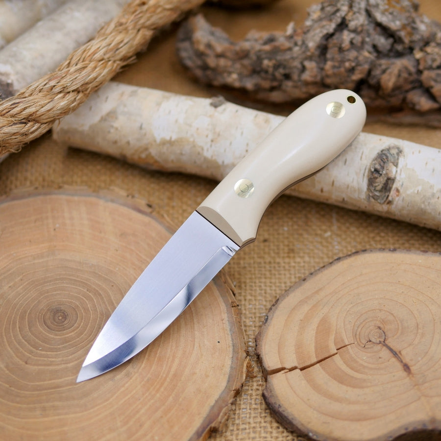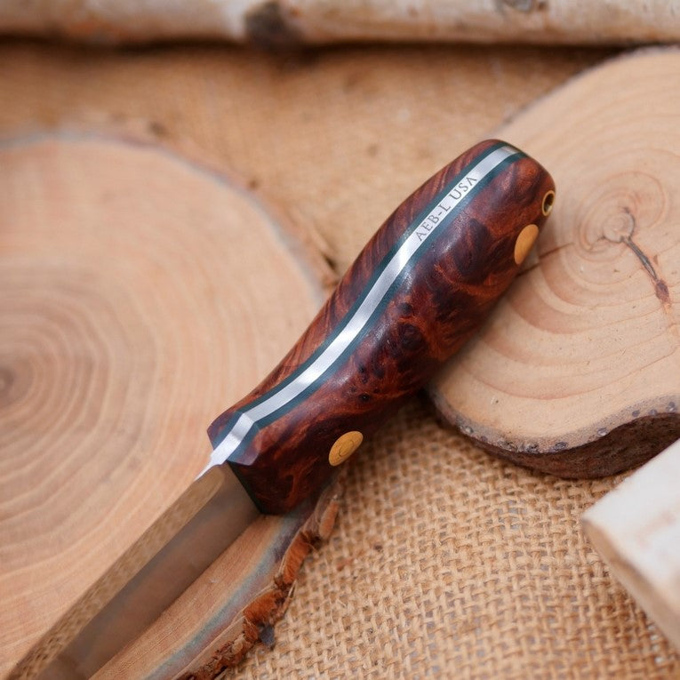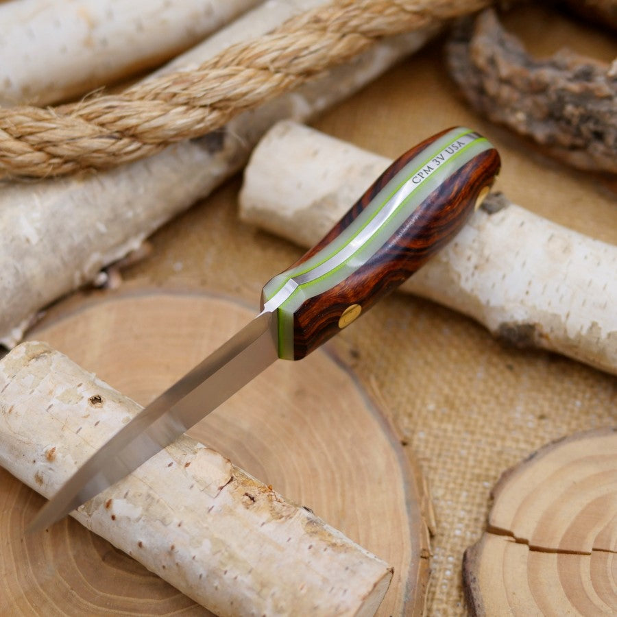 The Walker is a compact bushcraft knife. Its blade has a 3" cutting edge and a drop-spearpoint shape, allowing for excellent control and detail in woodcarving tasks. The stout blade can handle batonning of logs up to wrist-thickness. Designed to be comfortable in any grip, the Walker's short handle and teardrop contour fills the hand very well, allowing switching grips to feel effortless. The Walker may serve as the lightweight bushcrafter's sole cutting tool, or pairs perfectly with an axe or larger knife.