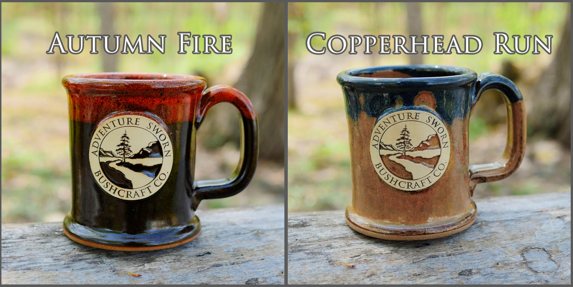 These mugs are handcrafted in the USA; wheel spun stoneware branded with our landscape Adventure Sworn Bushcraft Co. logo.