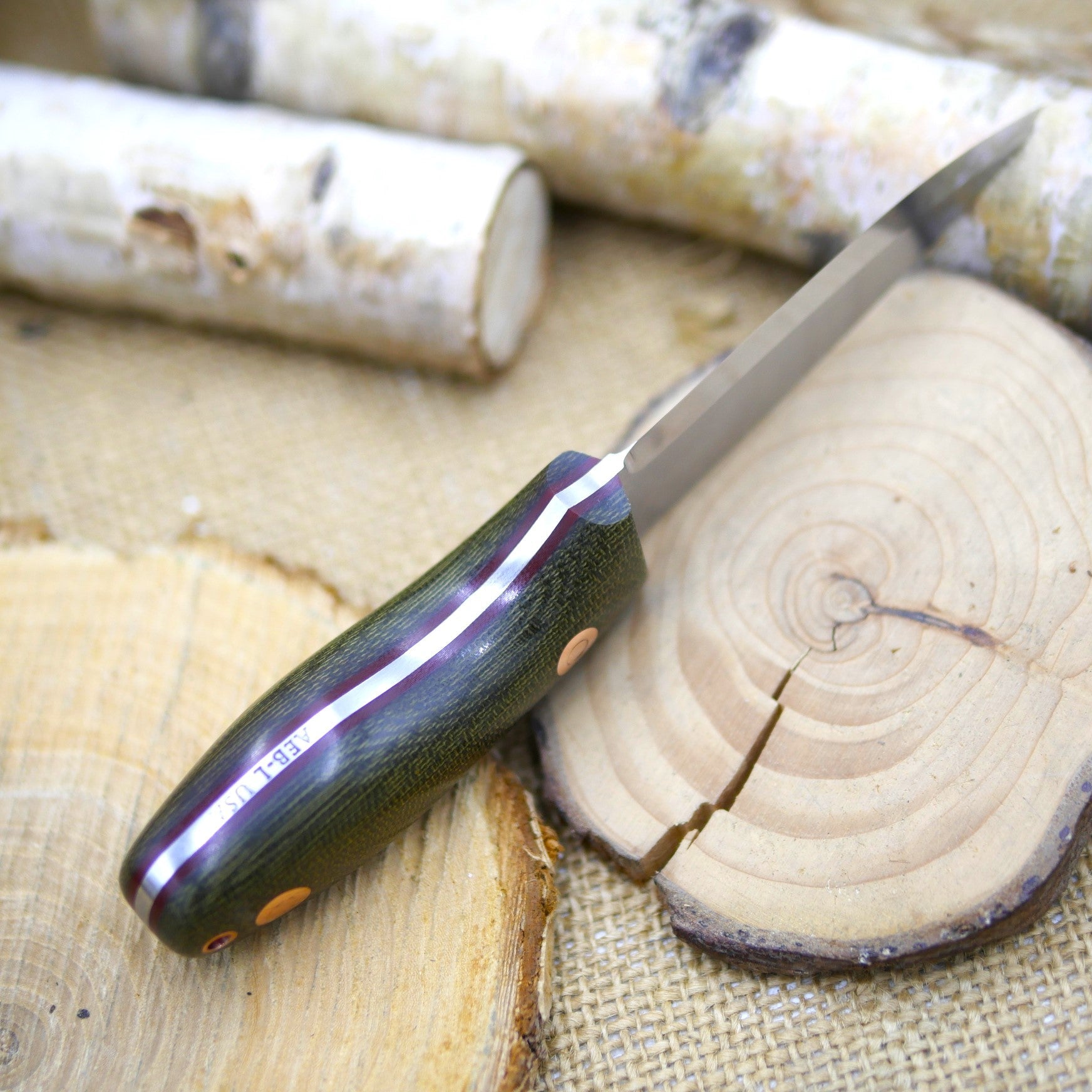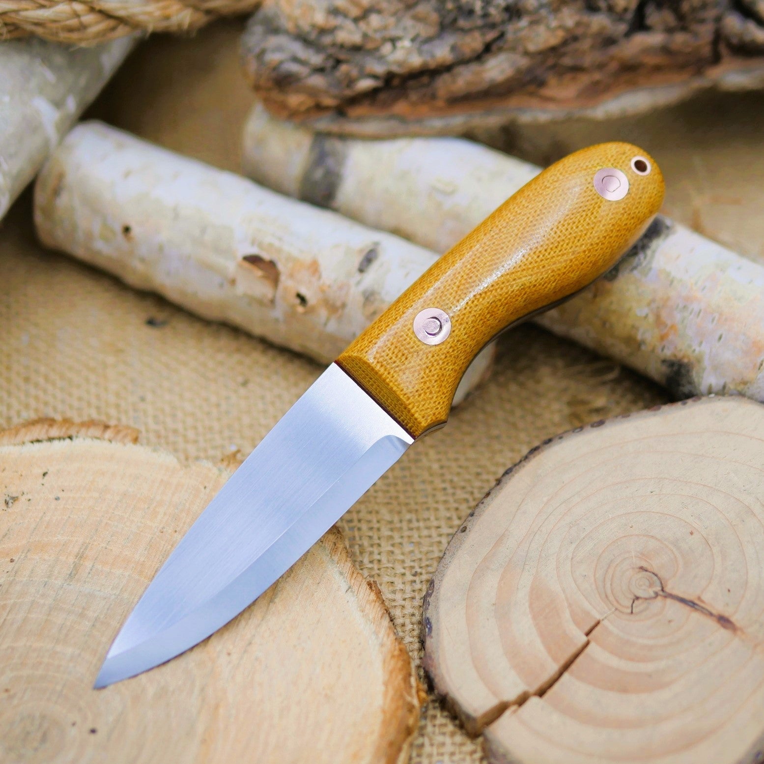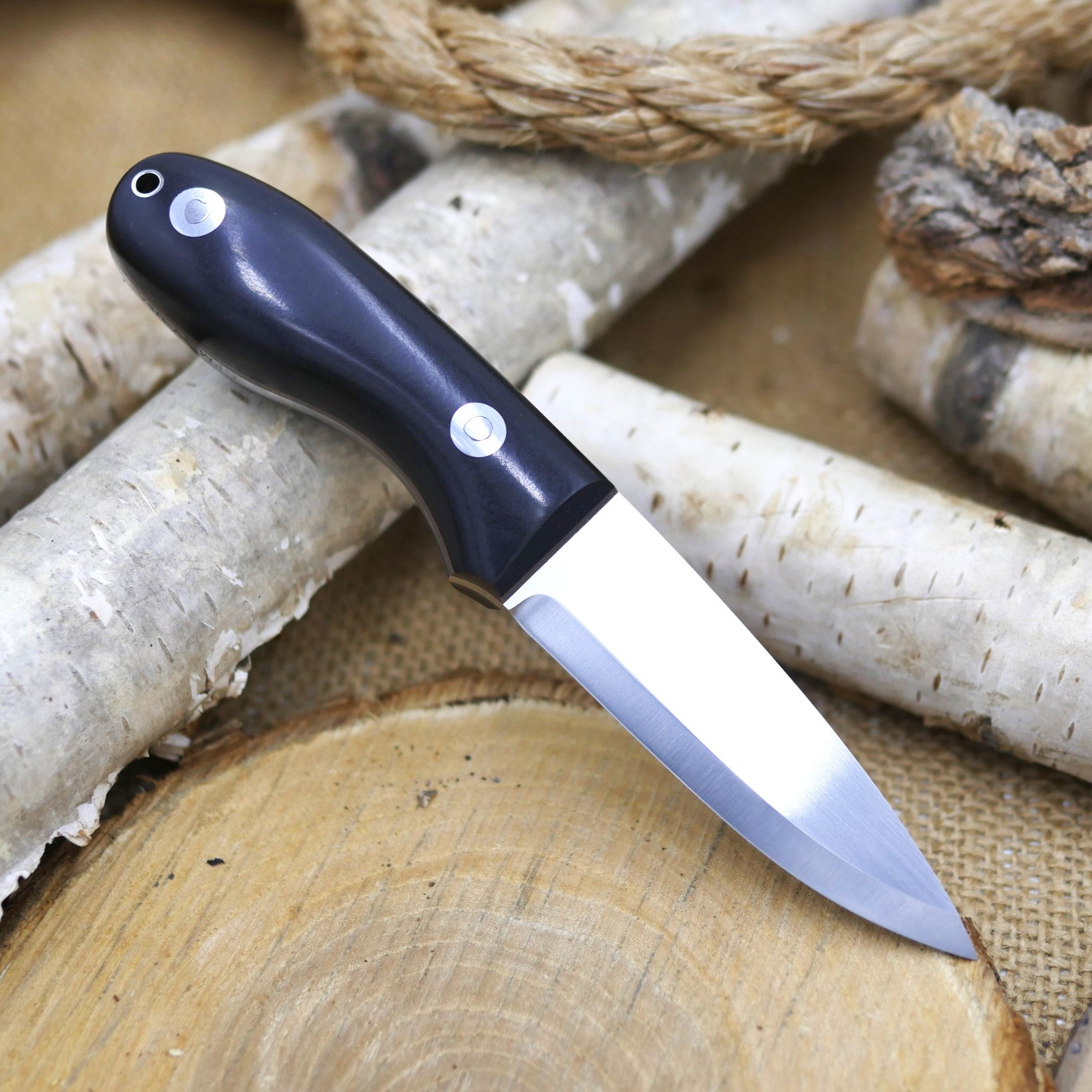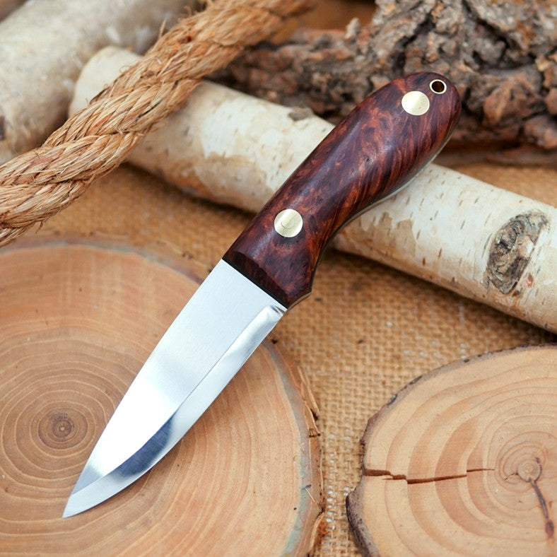 The Walker is a compact bushcraft knife.  Its blade has a 3" cutting edge and a drop-spearpoint shape, allowing for excellent control and detail in woodcarving tasks.  The stout blade can handle batonning of logs up to wrist-thickness.  Designed to be comfortable in any grip, the Walker's short handle and teardrop contour fills the hand very well, allowing switching grips to feel effortless.  The Walker may serve as the lightweight bushcrafter's sole cutting tool, or pairs perfectly with an axe or larger knife.