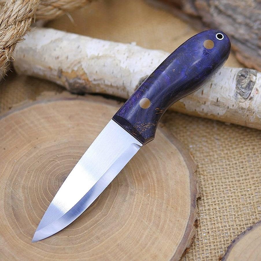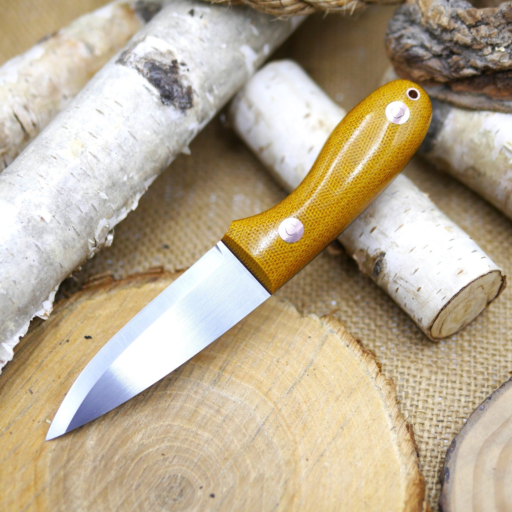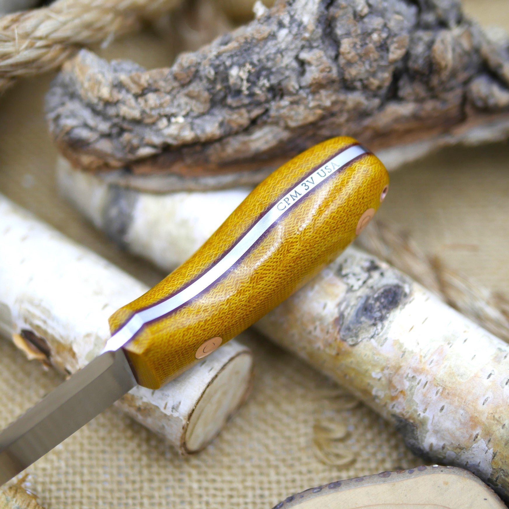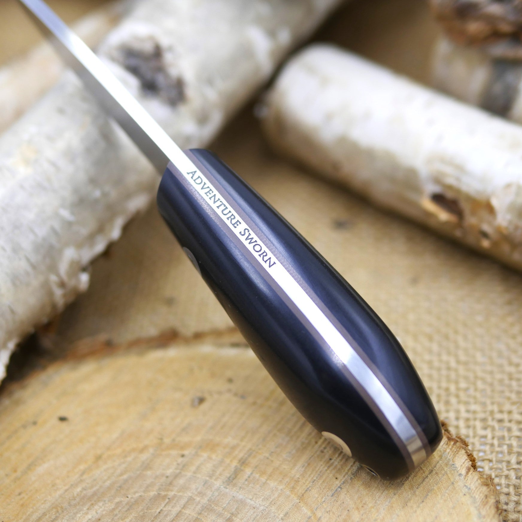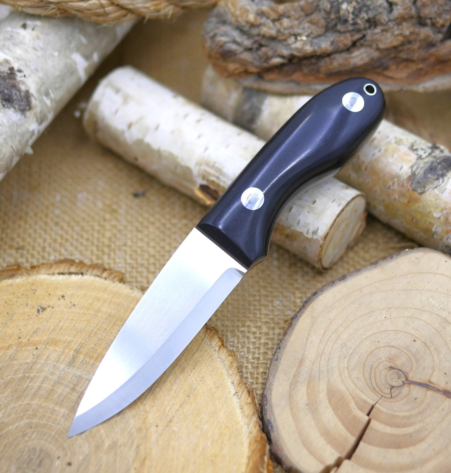 The Walker is a compact bushcraft knife.  Its blade has a 3" cutting edge and a drop-spearpoint shape, allowing for excellent control and detail in woodcarving tasks.  The stout blade can handle batonning of logs up to wrist-thickness.  Designed to be comfortable in any grip, the Walker's short handle and teardrop contour fills the hand very well, allowing switching grips to feel effortless.  The Walker may serve as the lightweight bushcrafter's sole cutting tool, or pairs perfectly with an axe or larger knife.