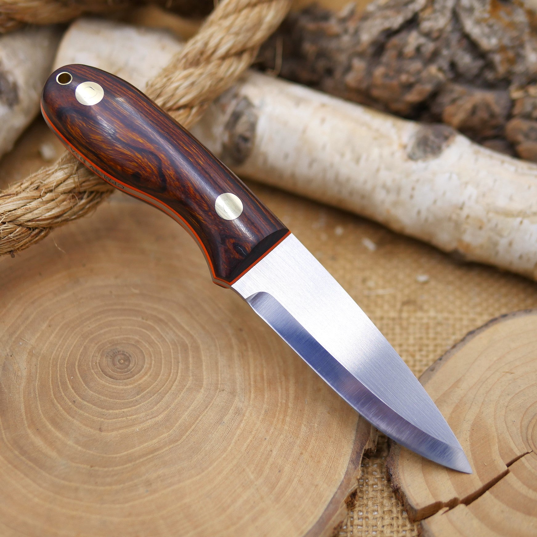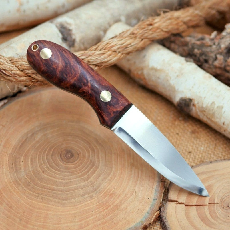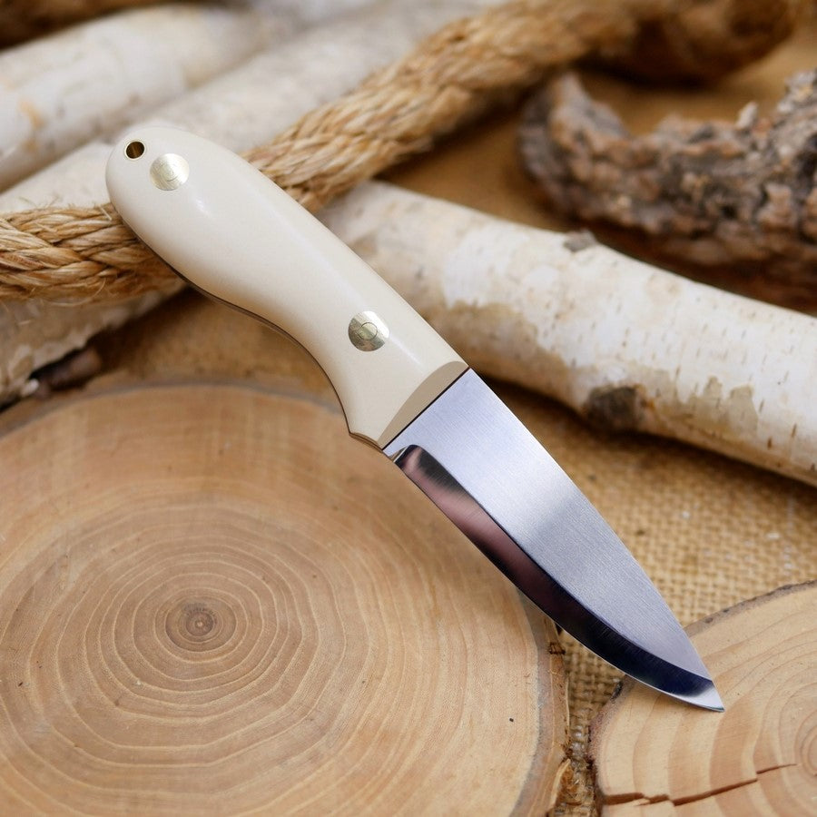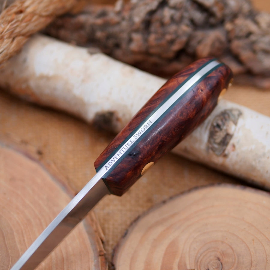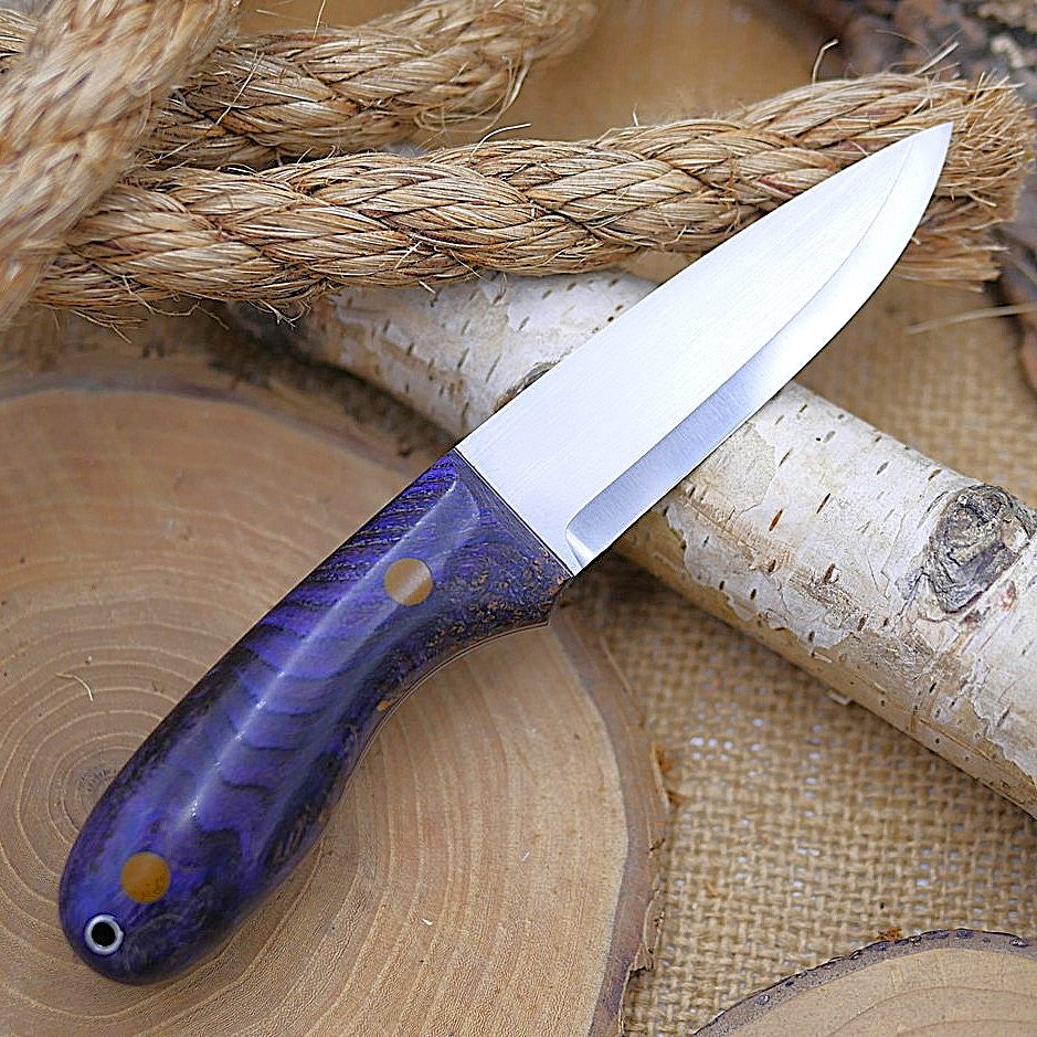 The Walker is a compact bushcraft knife.  Its blade has a 3" cutting edge and a drop-spearpoint shape, allowing for excellent control and detail in woodcarving tasks.  The stout blade can handle batonning of logs up to wrist-thickness.  Designed to be comfortable in any grip, the Walker's short handle and teardrop contour fills the hand very well, allowing switching grips to feel effortless.  The Walker may serve as the lightweight bushcrafter's sole cutting tool, or pairs perfectly with an axe or larger knife.