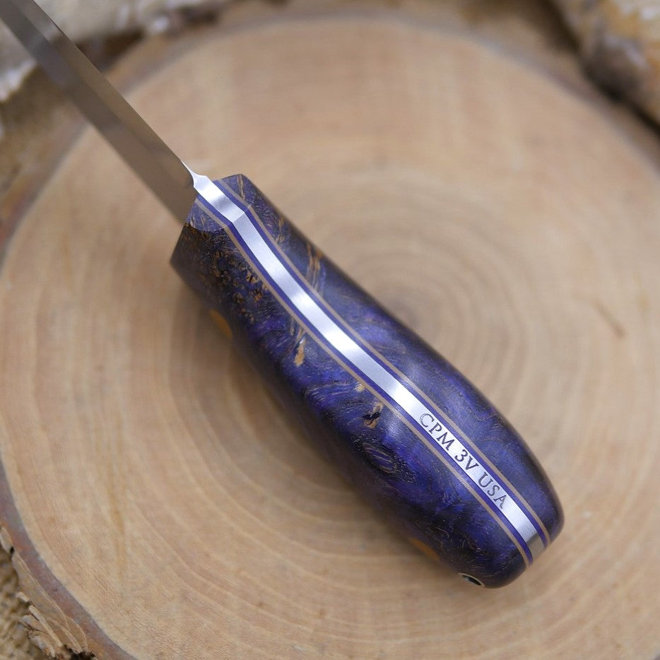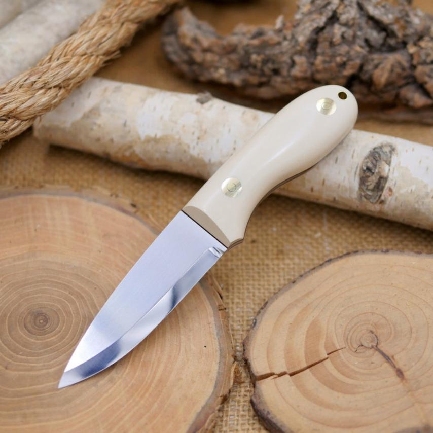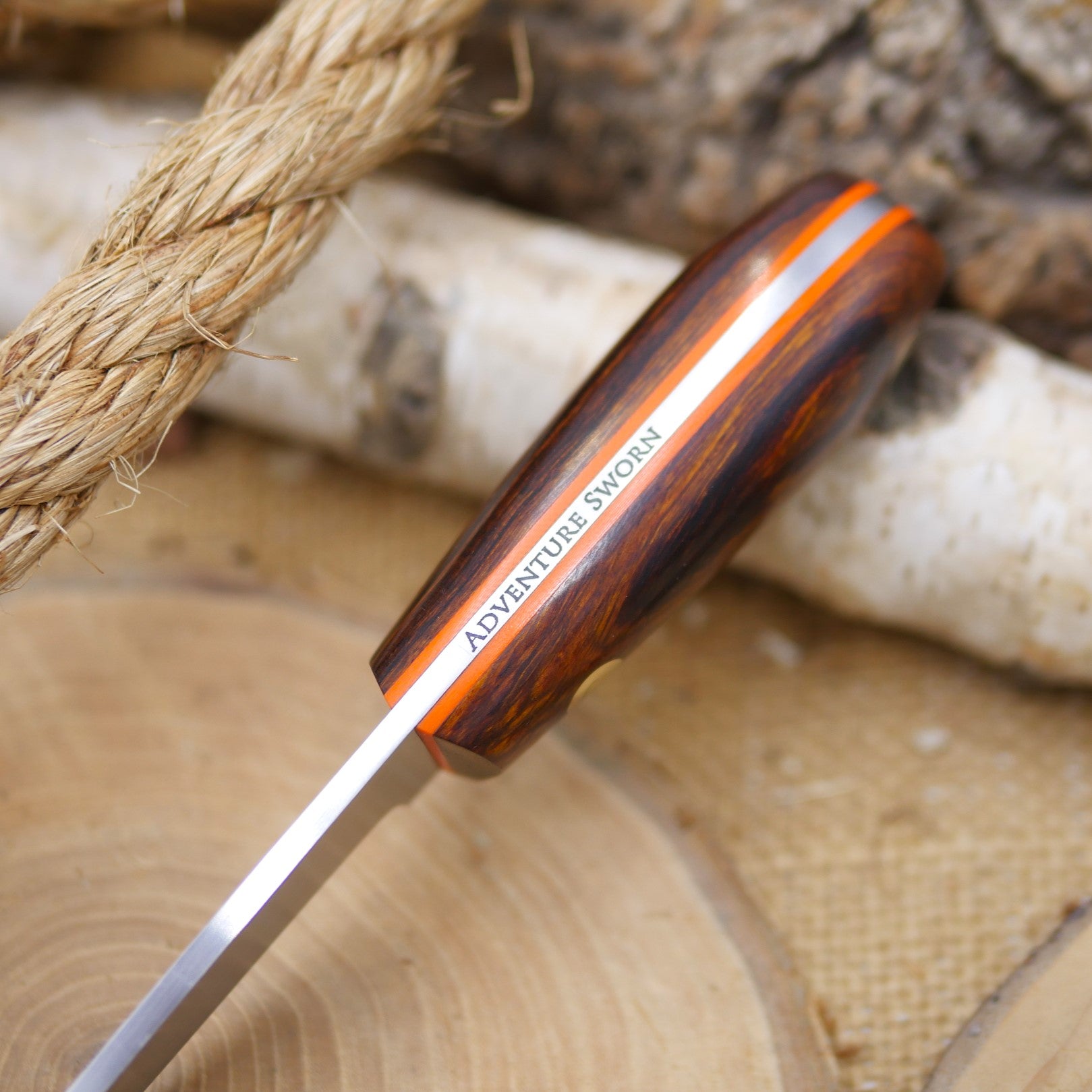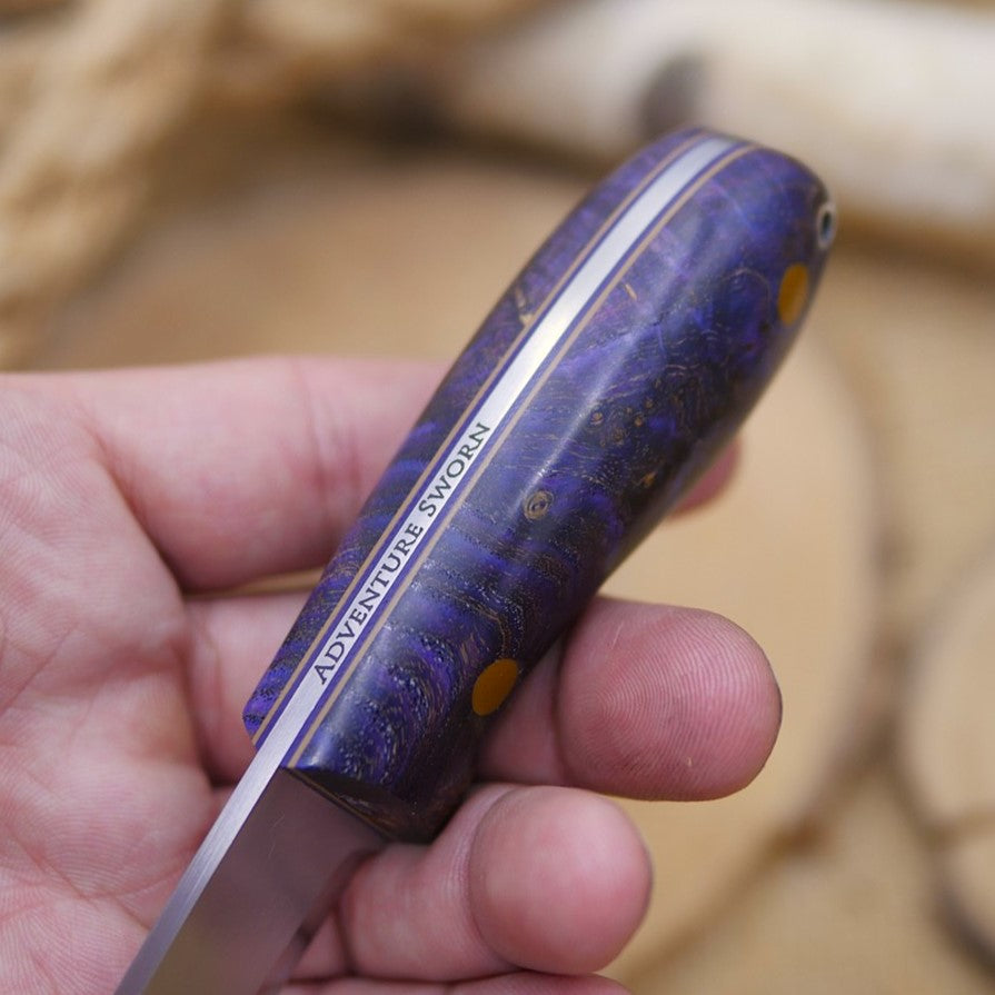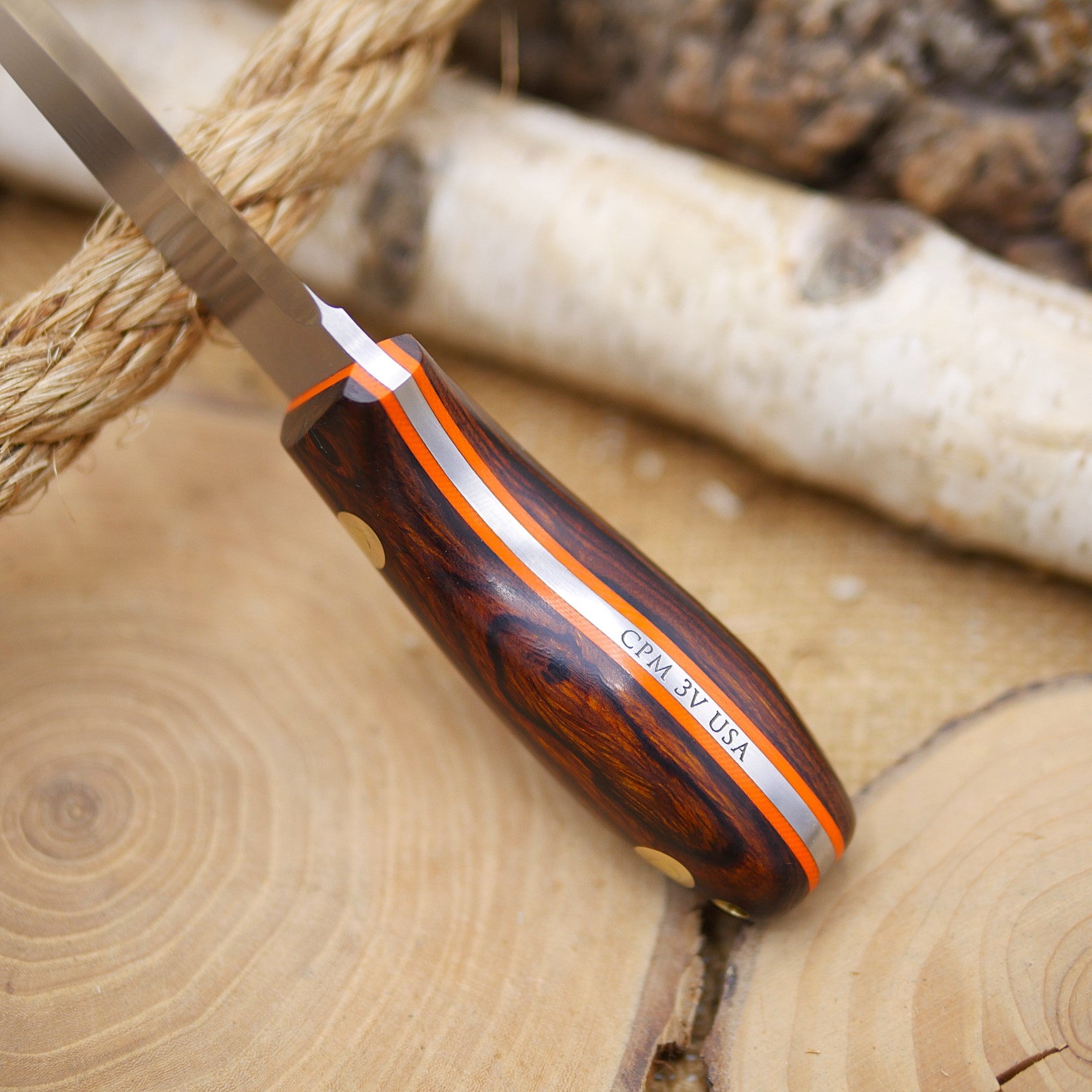 The Walker is a compact bushcraft knife.  Its blade has a 3" cutting edge and a drop-spearpoint shape, allowing for excellent control and detail in woodcarving tasks.  The stout blade can handle batonning of logs up to wrist-thickness.  Designed to be comfortable in any grip, the Walker's short handle and teardrop contour fills the hand very well, allowing switching grips to feel effortless.  The Walker may serve as the lightweight bushcrafter's sole cutting tool, or pairs perfectly with an axe or larger knife.
