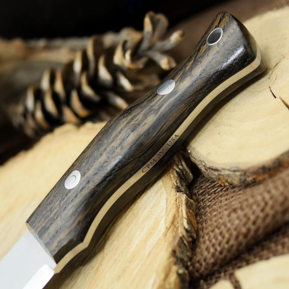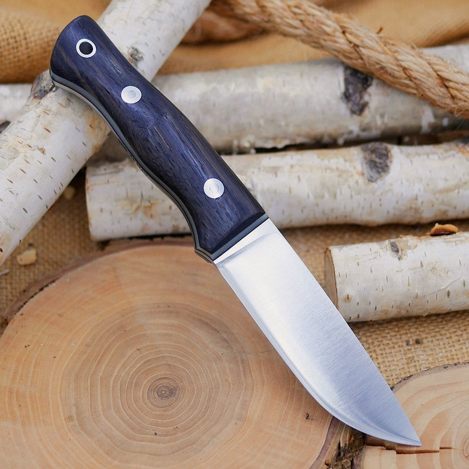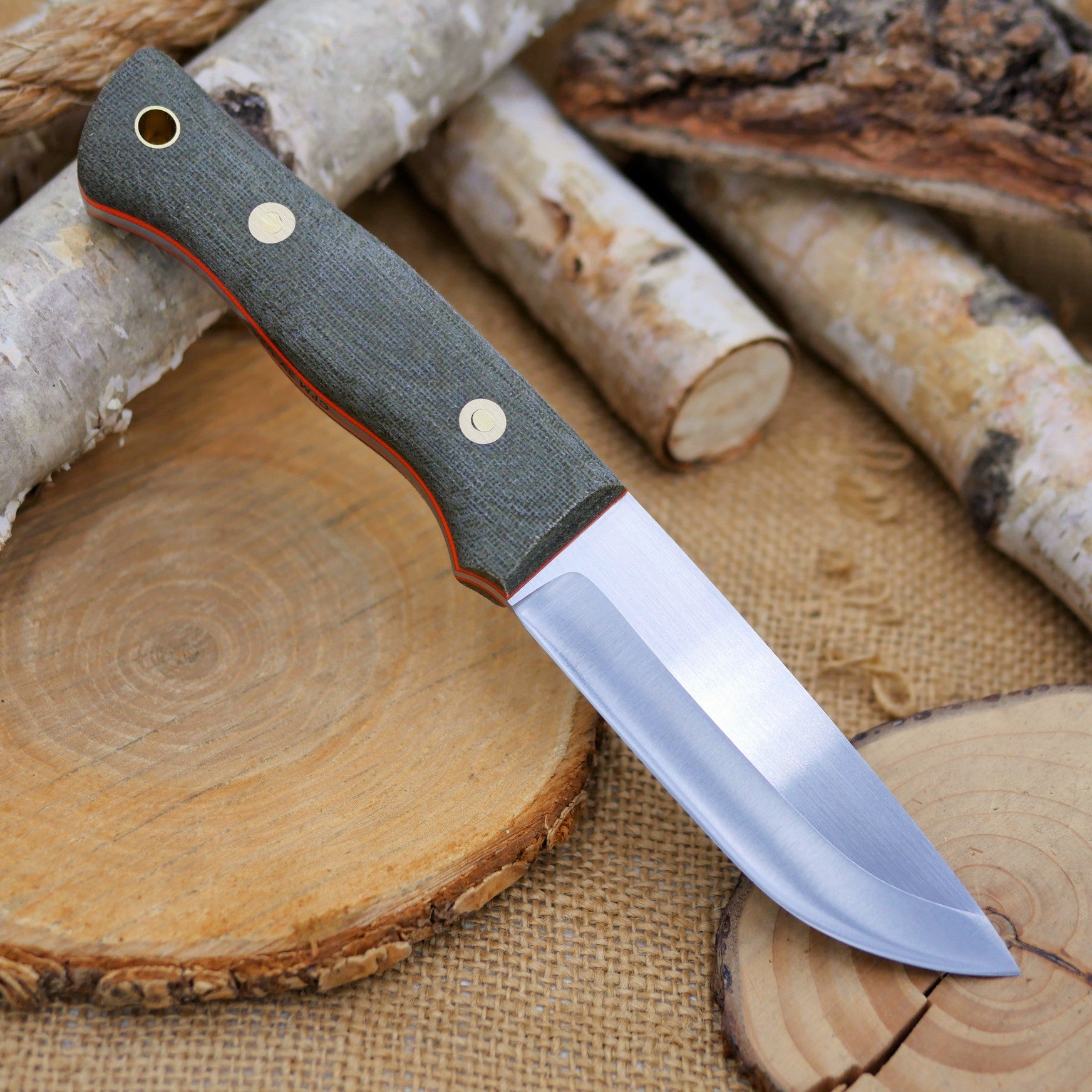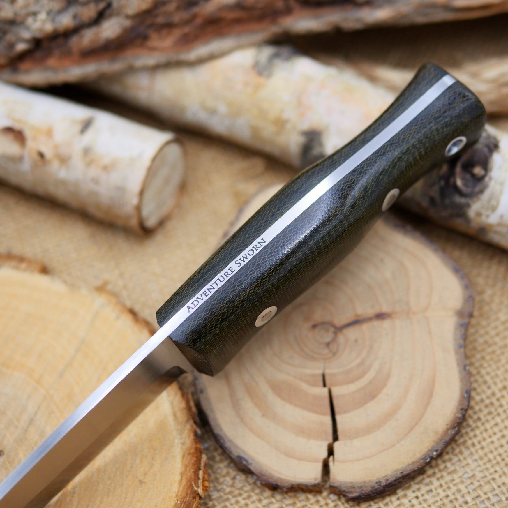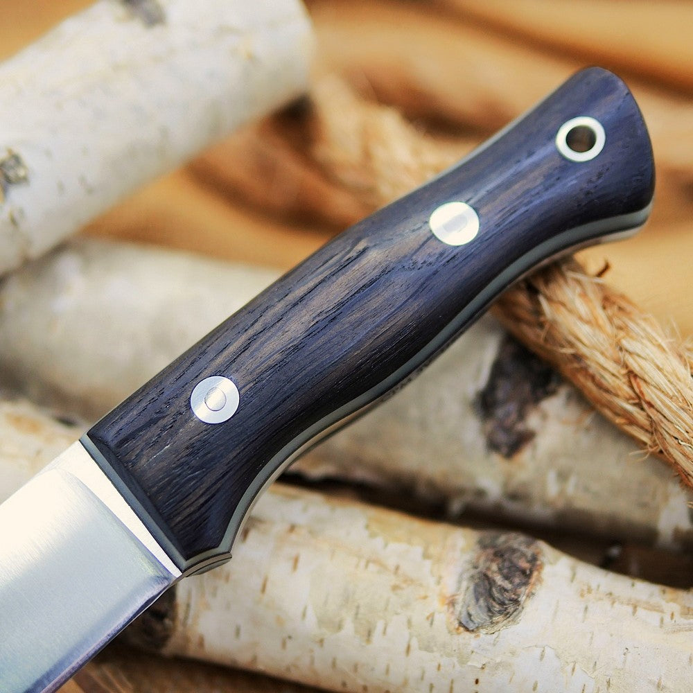 The Huntsman is a bushcraft-hunting knife hybrid which excels at processing wood and game alike. Its dimensions make it excellent for skinning, gutting, and slicing, as well as making tent stakes, whittling traps, or carving a canoe paddle. The knife is built strong enough to handle anything from building a shelter to splitting logs for the fire, a true companion to the outdoorsman. Crafted in the USA.