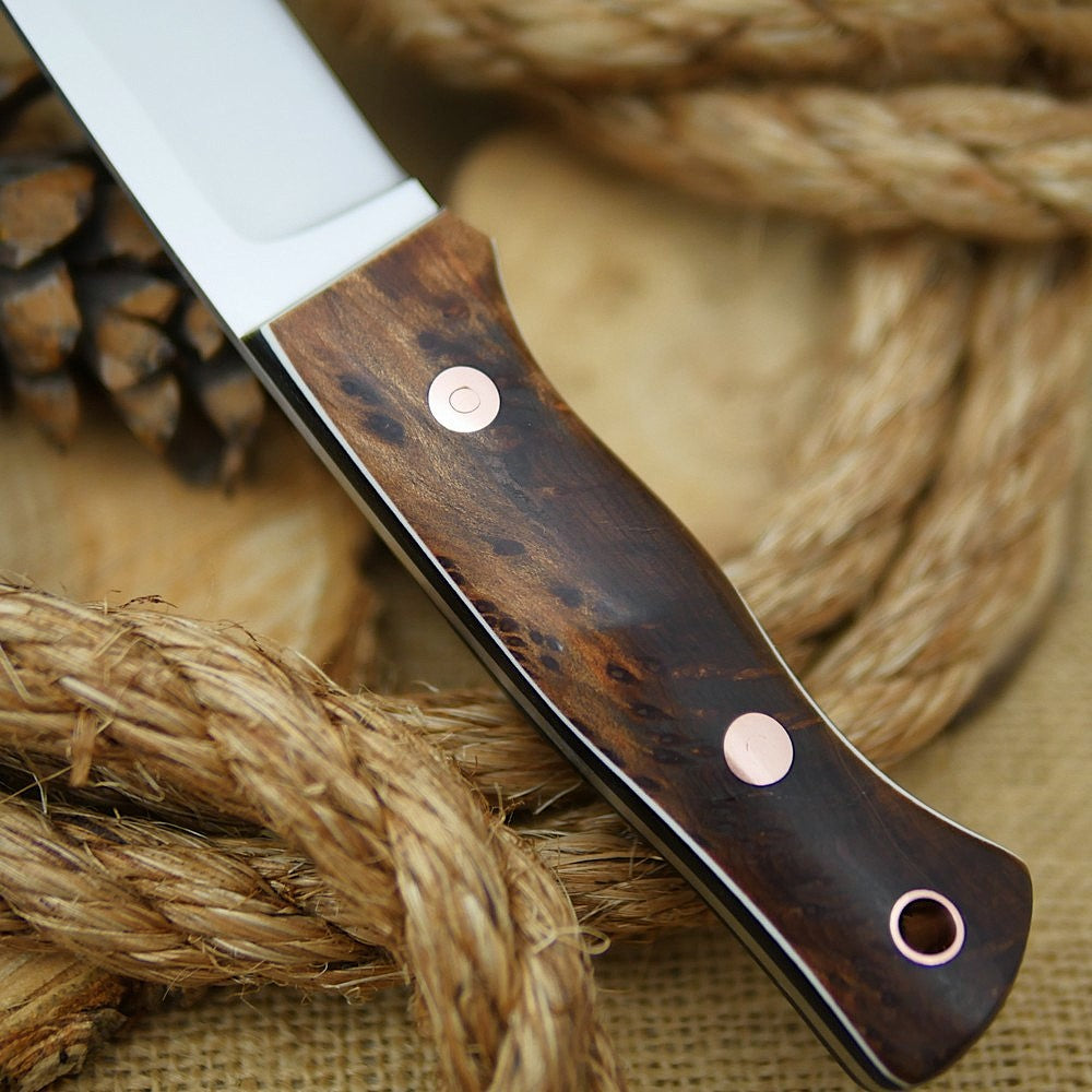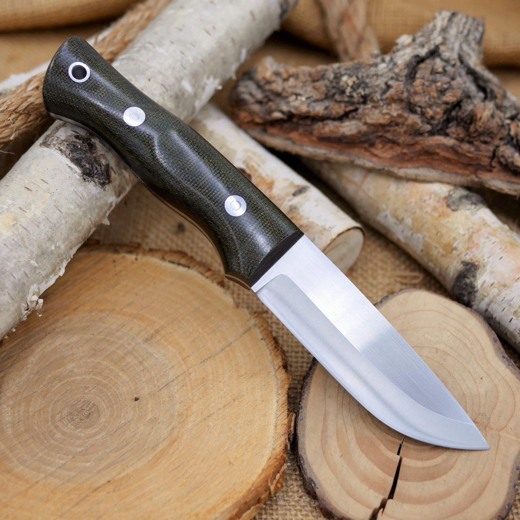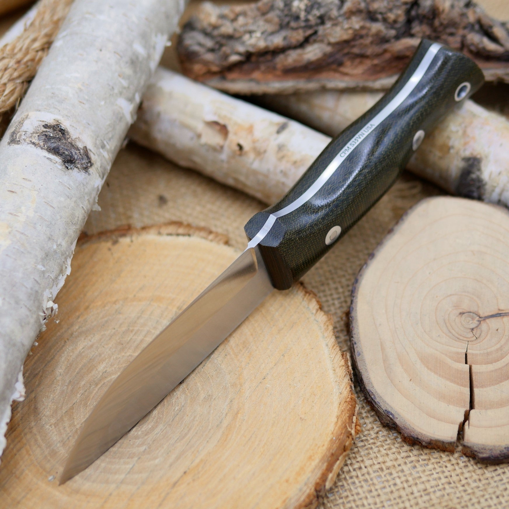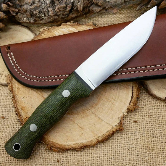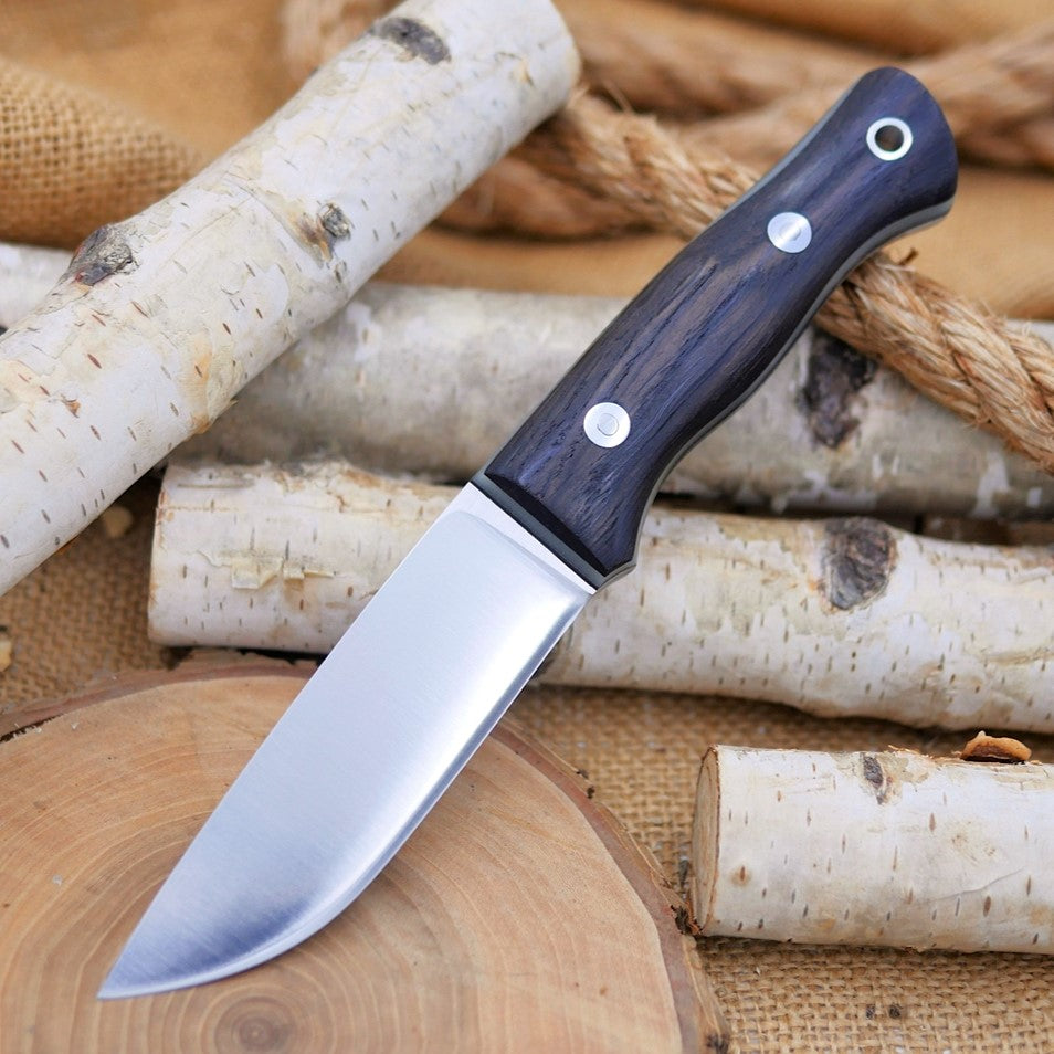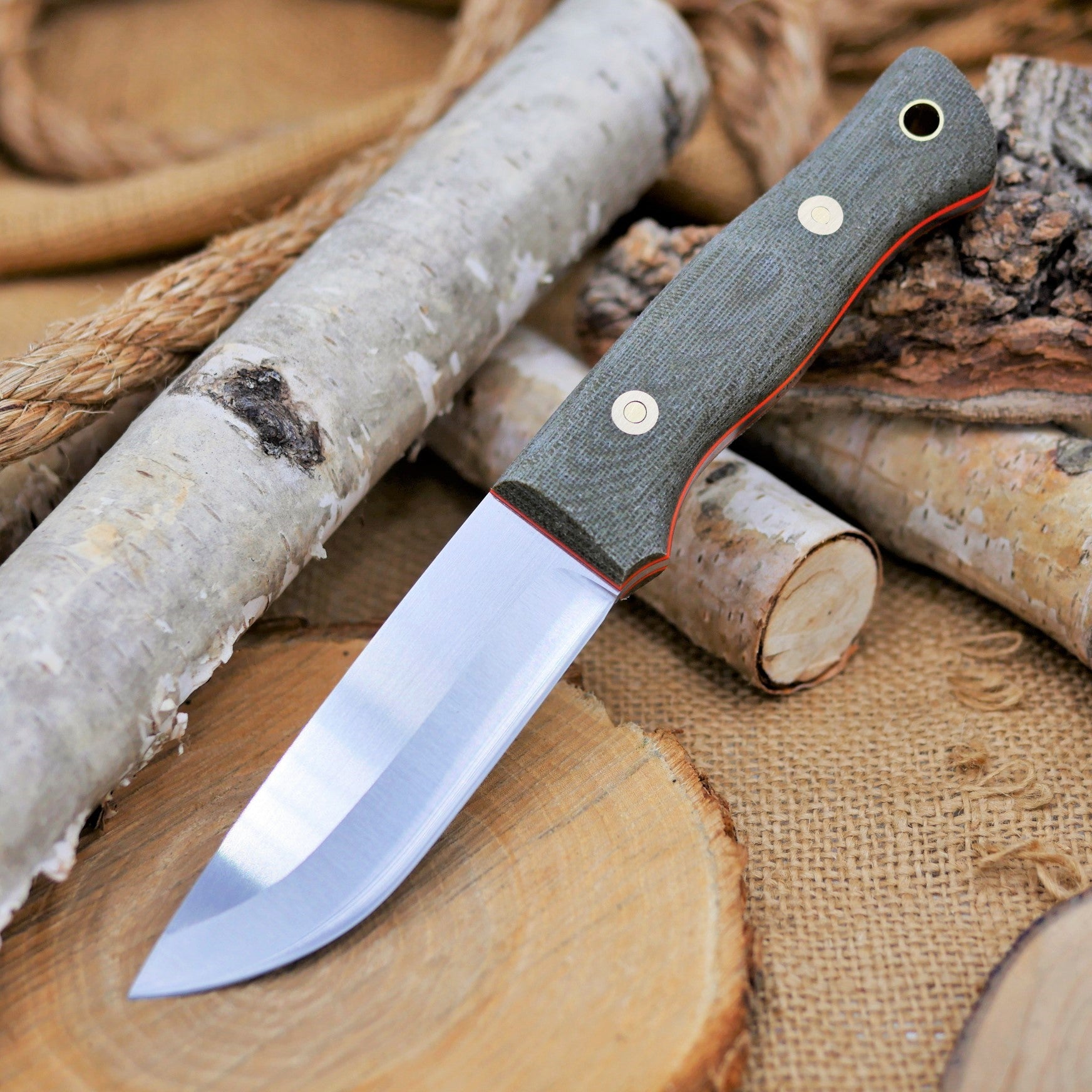 The Huntsman is a bushcraft-hunting knife hybrid which excels at processing wood and game alike. Its dimensions make it excellent for skinning, gutting, and slicing, as well as making tent stakes, whittling traps, or carving a canoe paddle. The knife is built strong enough to handle anything from building a shelter to splitting logs for the fire, a true companion to the outdoorsman. Crafted in the USA.