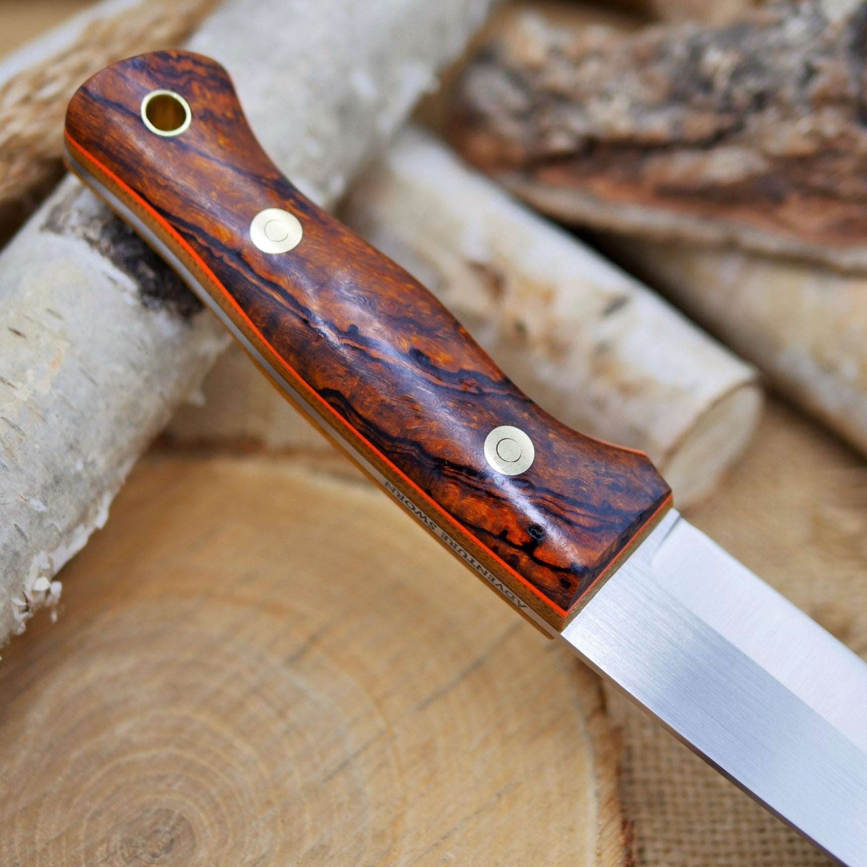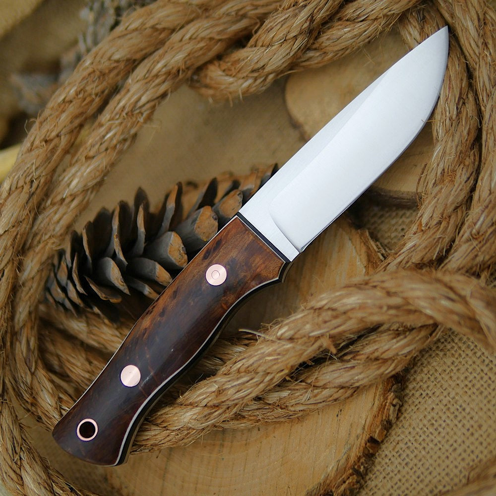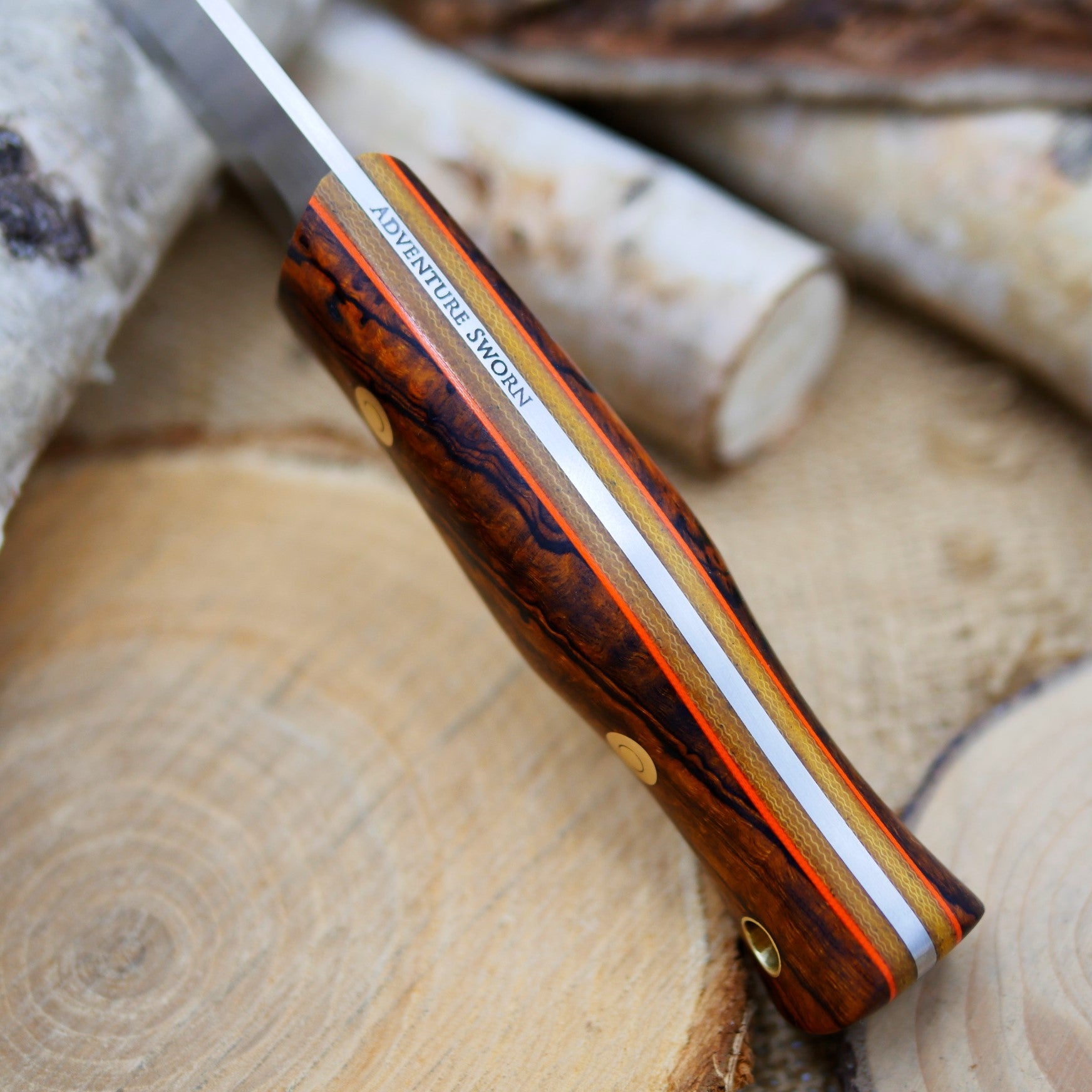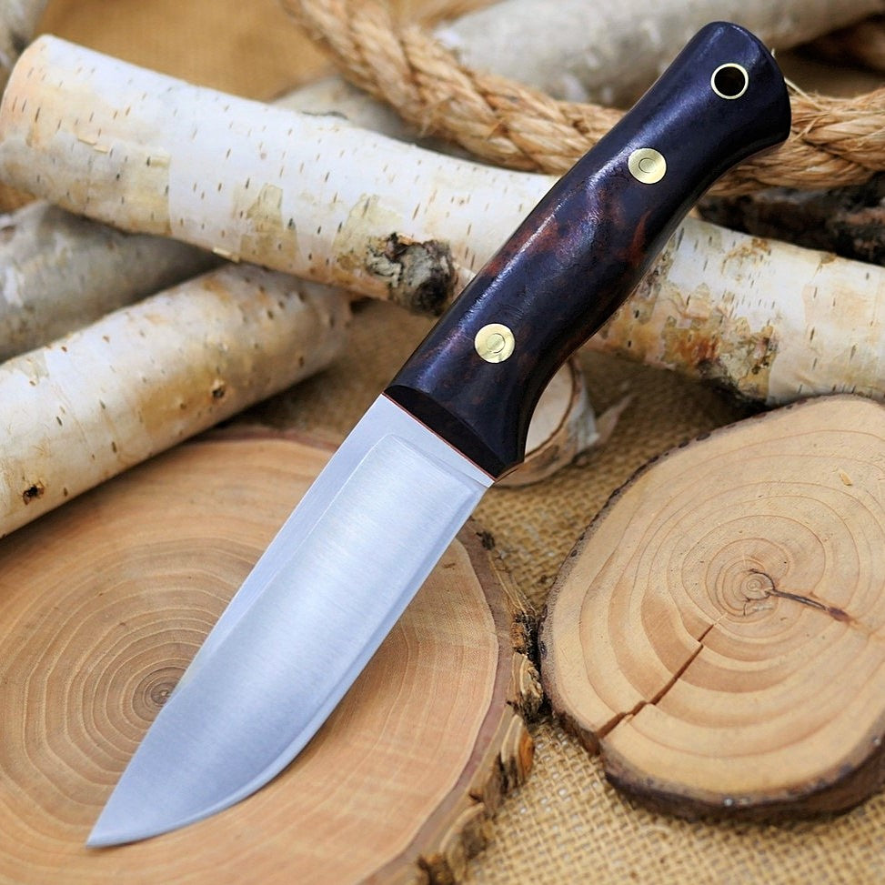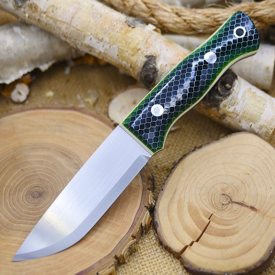 The Huntsman is a bushcraft-hunting knife hybrid which excels at processing wood and game alike. Its dimensions make it excellent for skinning, gutting, and slicing, as well as making tent stakes, whittling traps, or carving a canoe paddle. The knife is built strong enough to handle anything from building a shelter to splitting logs for the fire, a true companion to the outdoorsman. Crafted in the USA.