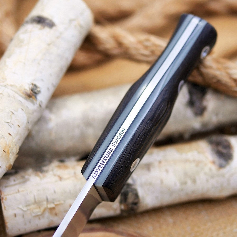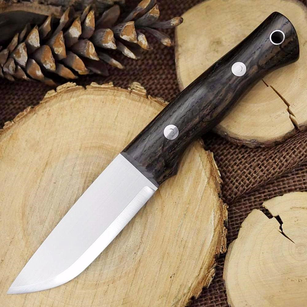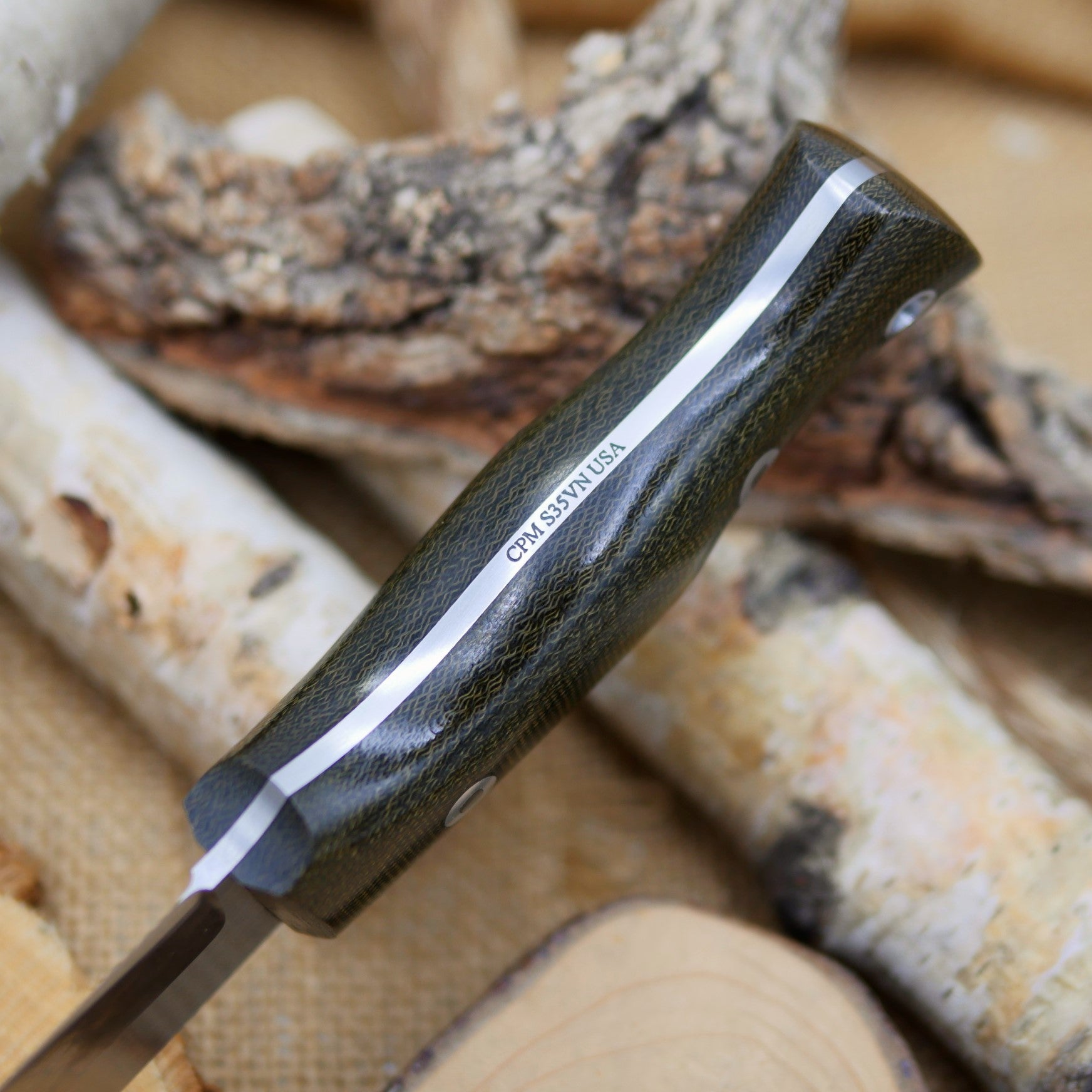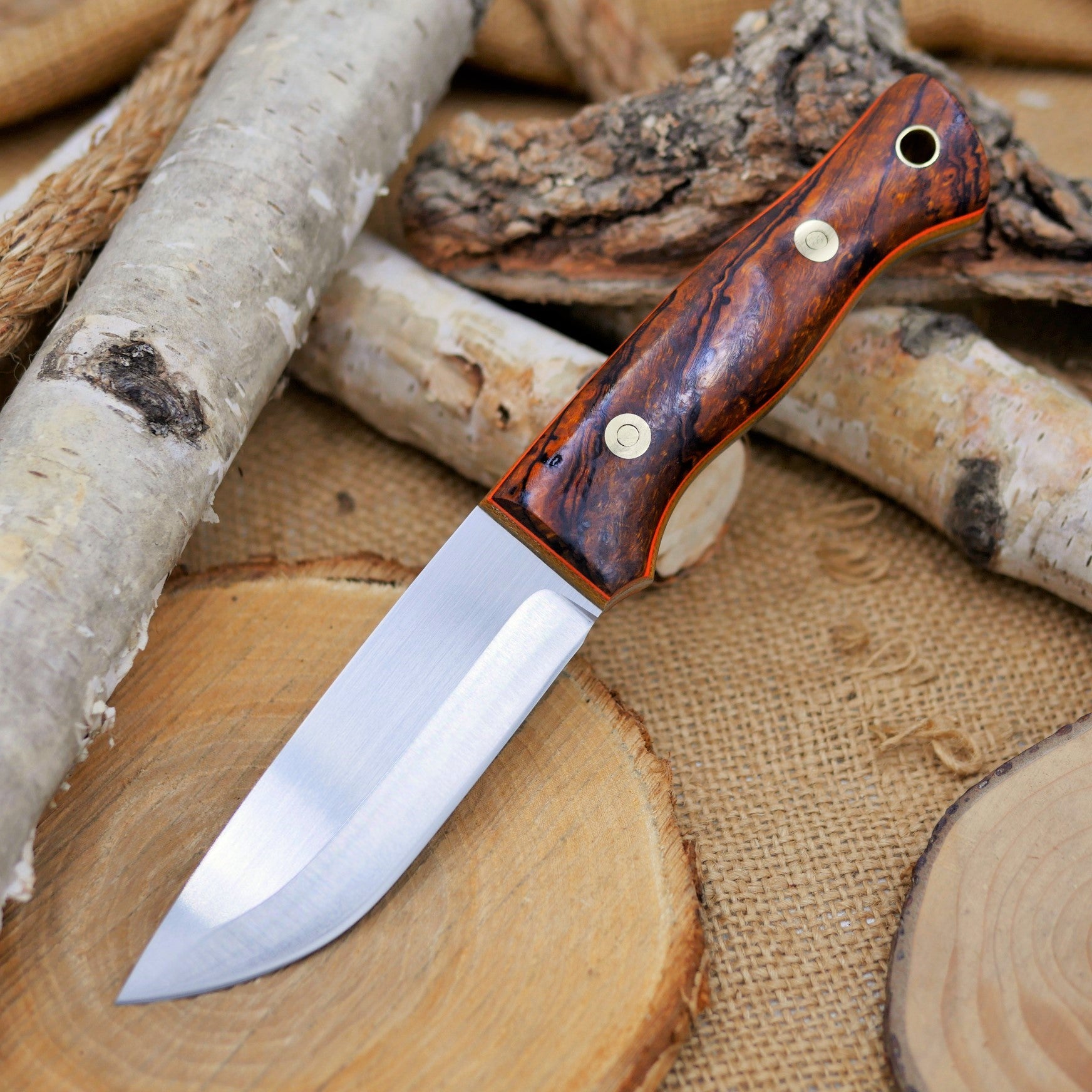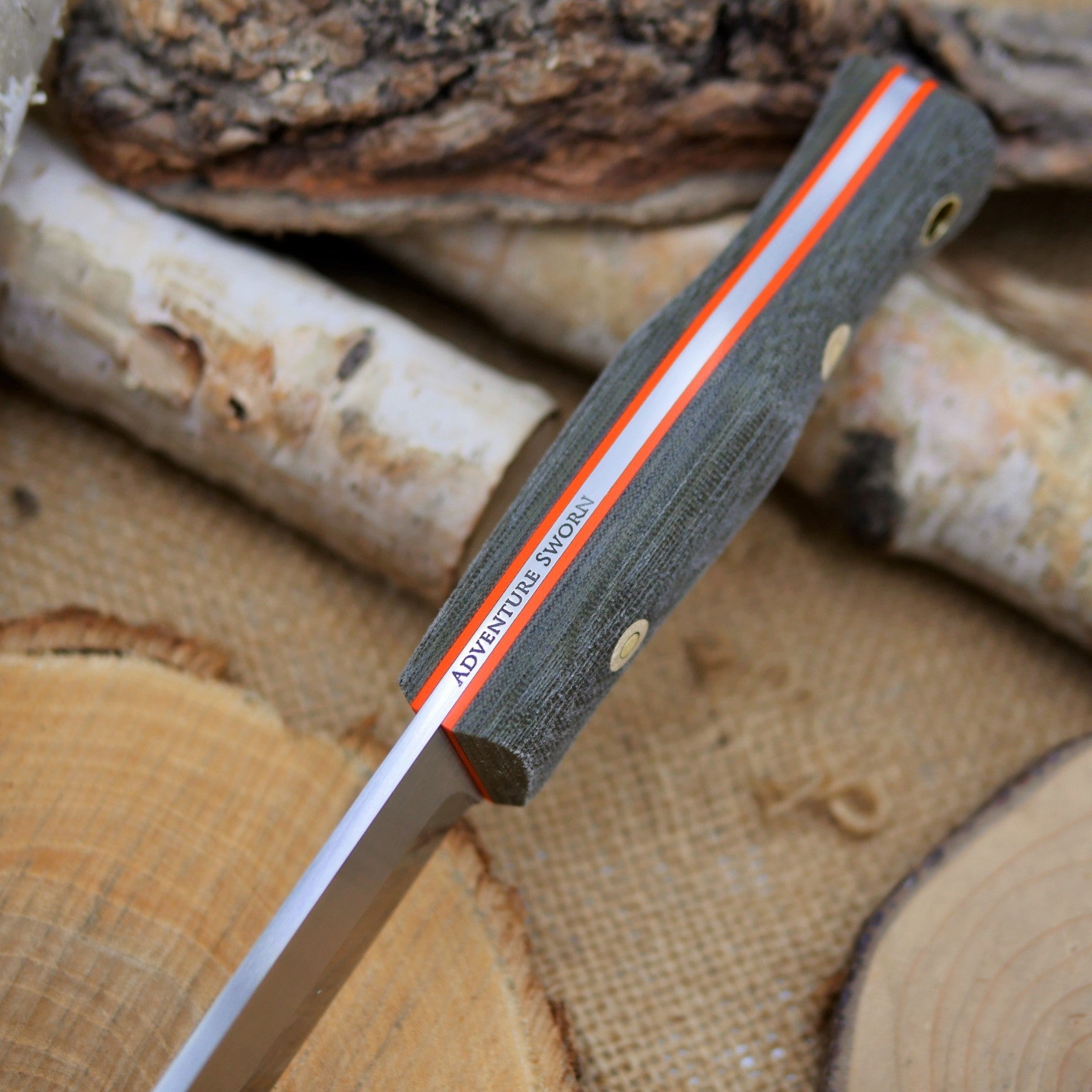 The Huntsman is a bushcraft-hunting knife hybrid which excels at processing wood and game alike. Its dimensions make it excellent for skinning, gutting, and slicing, as well as making tent stakes, whittling traps, or carving a canoe paddle. The knife is built strong enough to handle anything from building a shelter to splitting logs for the fire, a true companion to the outdoorsman. Crafted in the USA.