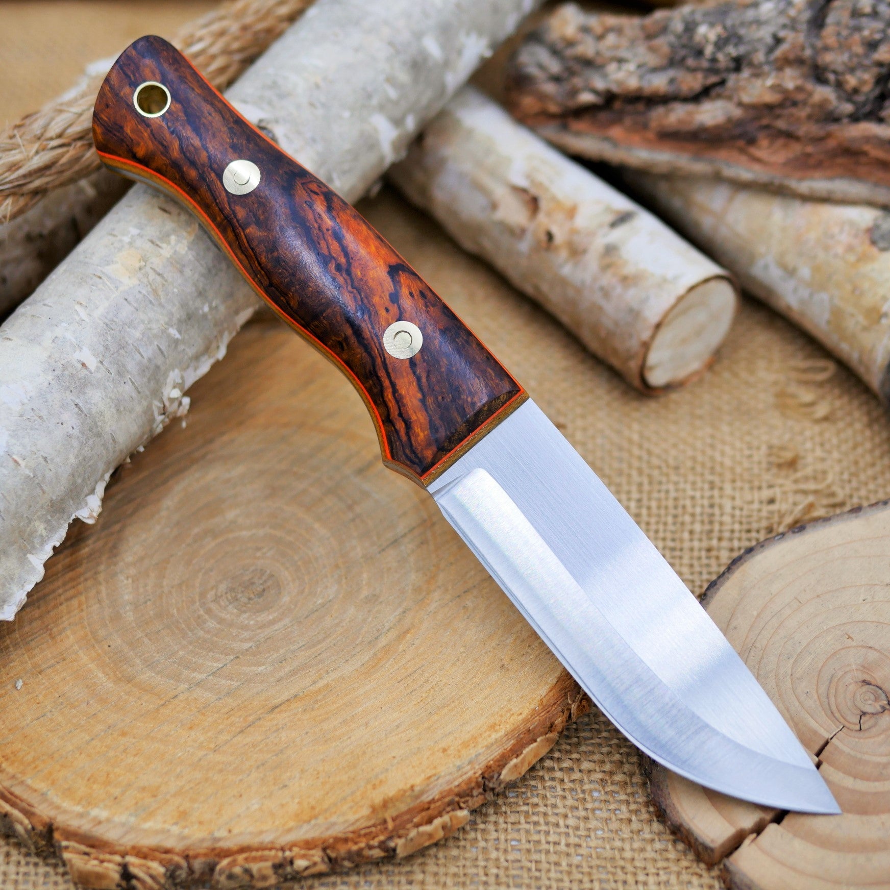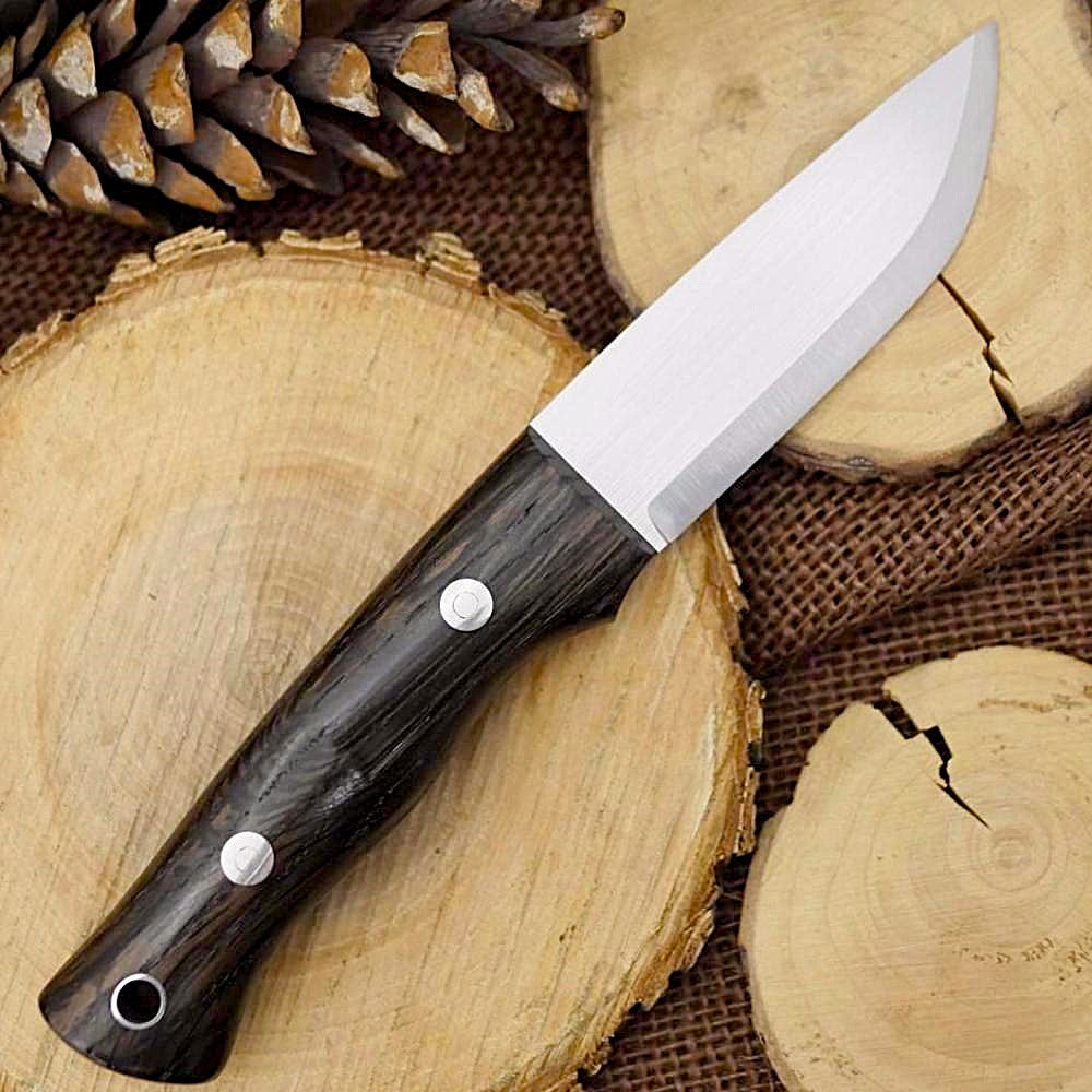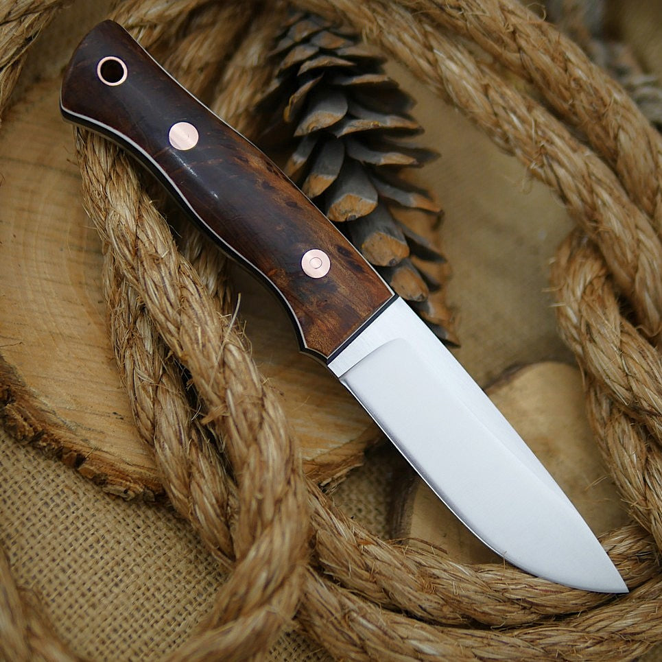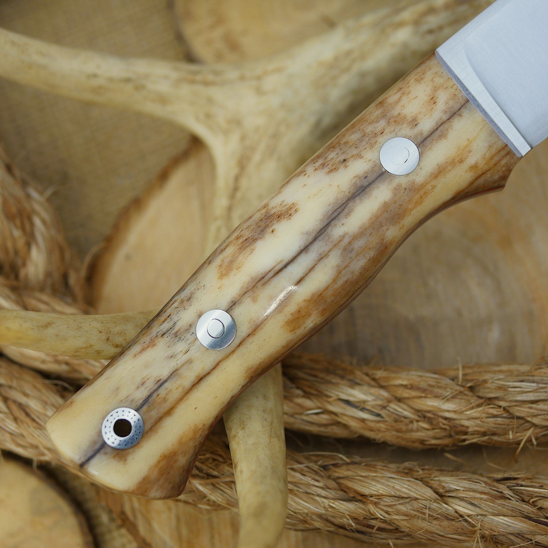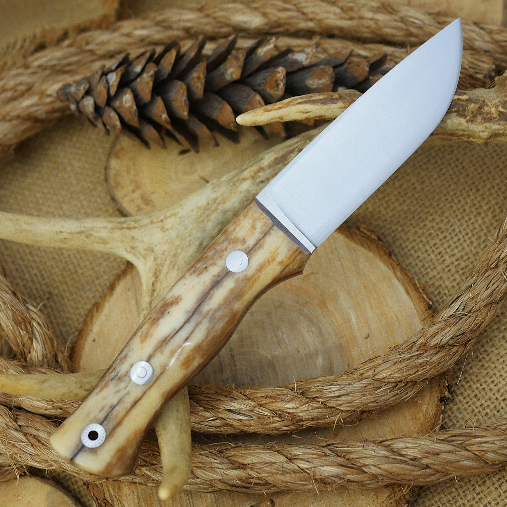The Huntsman is a bushcraft-hunting knife hybrid which excels at processing wood and game alike. Its dimensions make it excellent for skinning, gutting, and slicing, as well as making tent stakes, whittling traps, or carving a canoe paddle. The knife is built strong enough to handle anything from building a shelter to splitting logs for the fire, a true companion to the outdoorsman. Crafted in the USA.