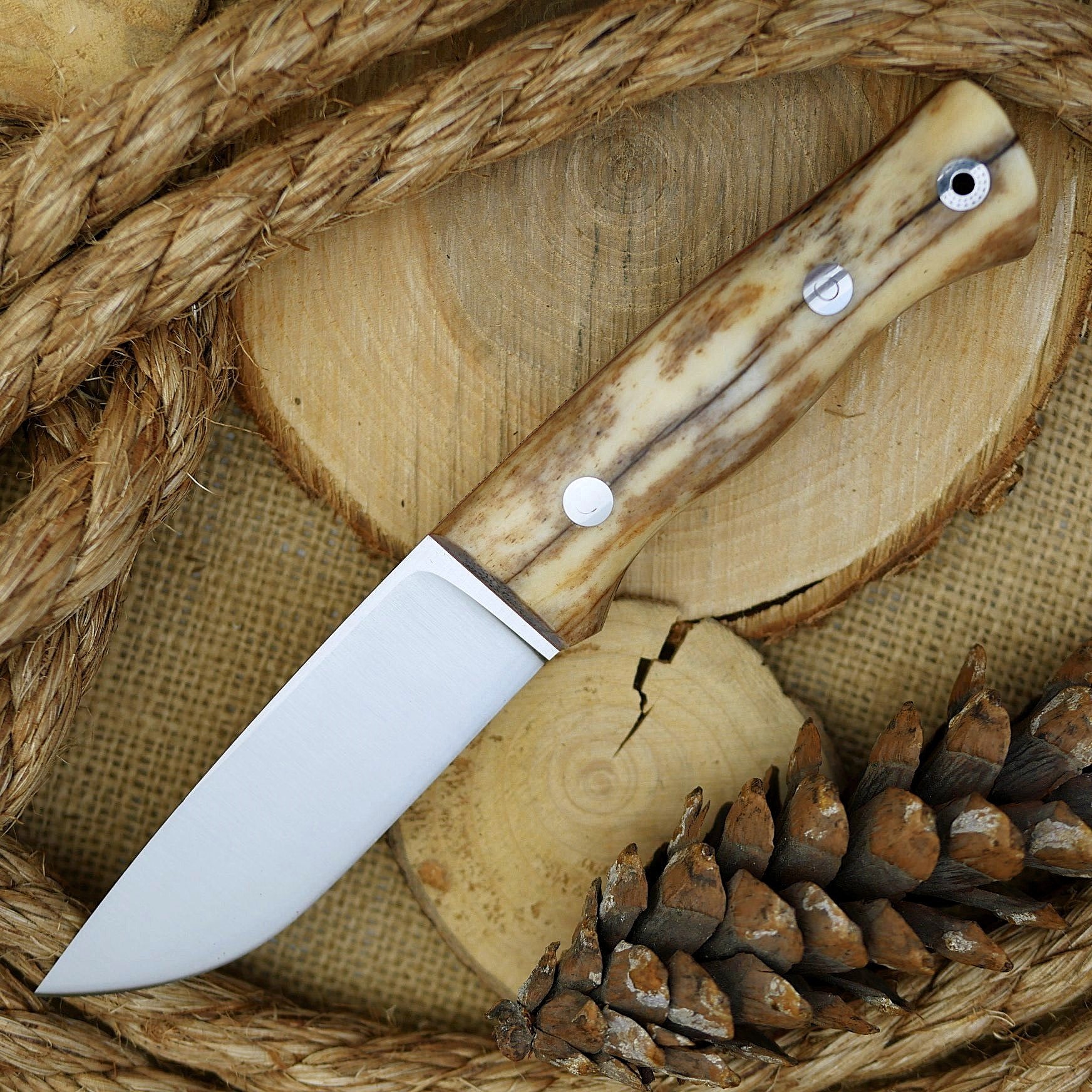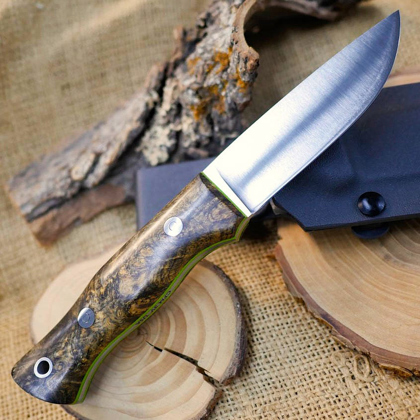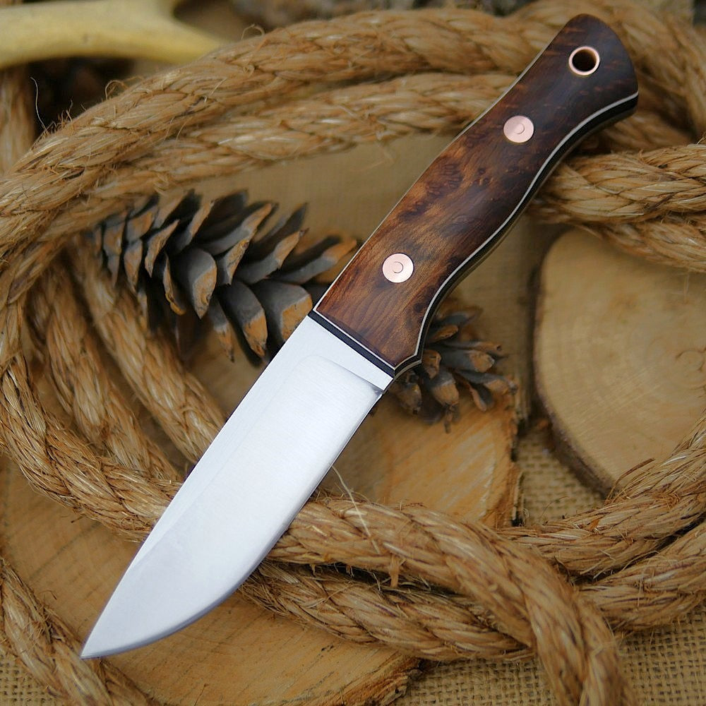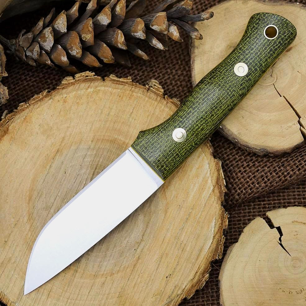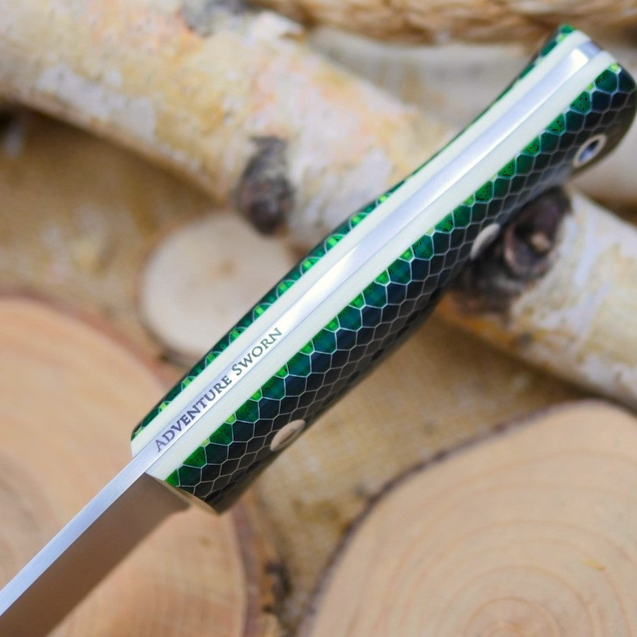 The Huntsman is a bushcraft-hunting knife hybrid which excels at processing wood and game alike. Its dimensions make it excellent for skinning, gutting, and slicing, as well as making tent stakes, whittling traps, or carving a canoe paddle. The knife is built strong enough to handle anything from building a shelter to splitting logs for the fire, a true companion to the outdoorsman. Crafted in the USA.