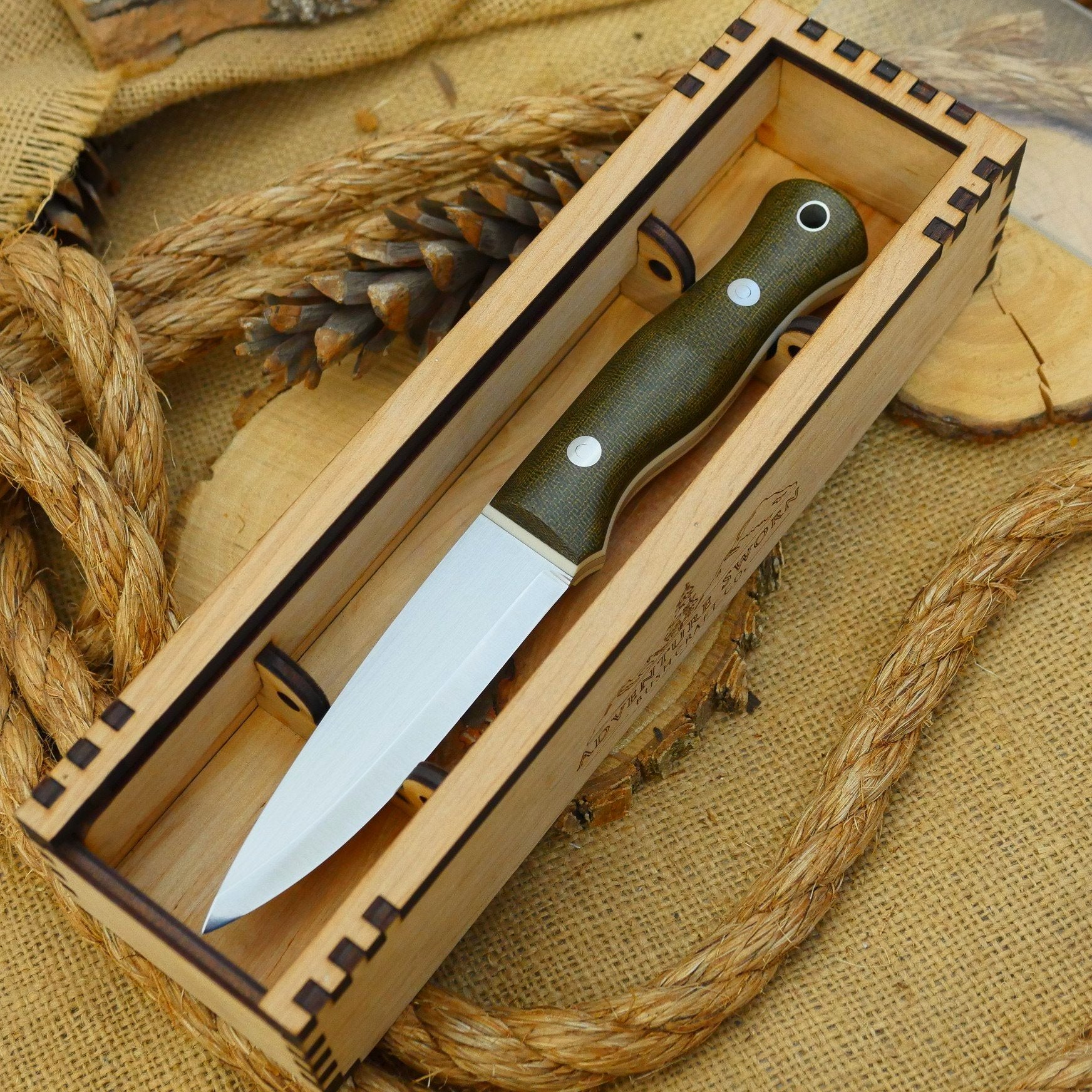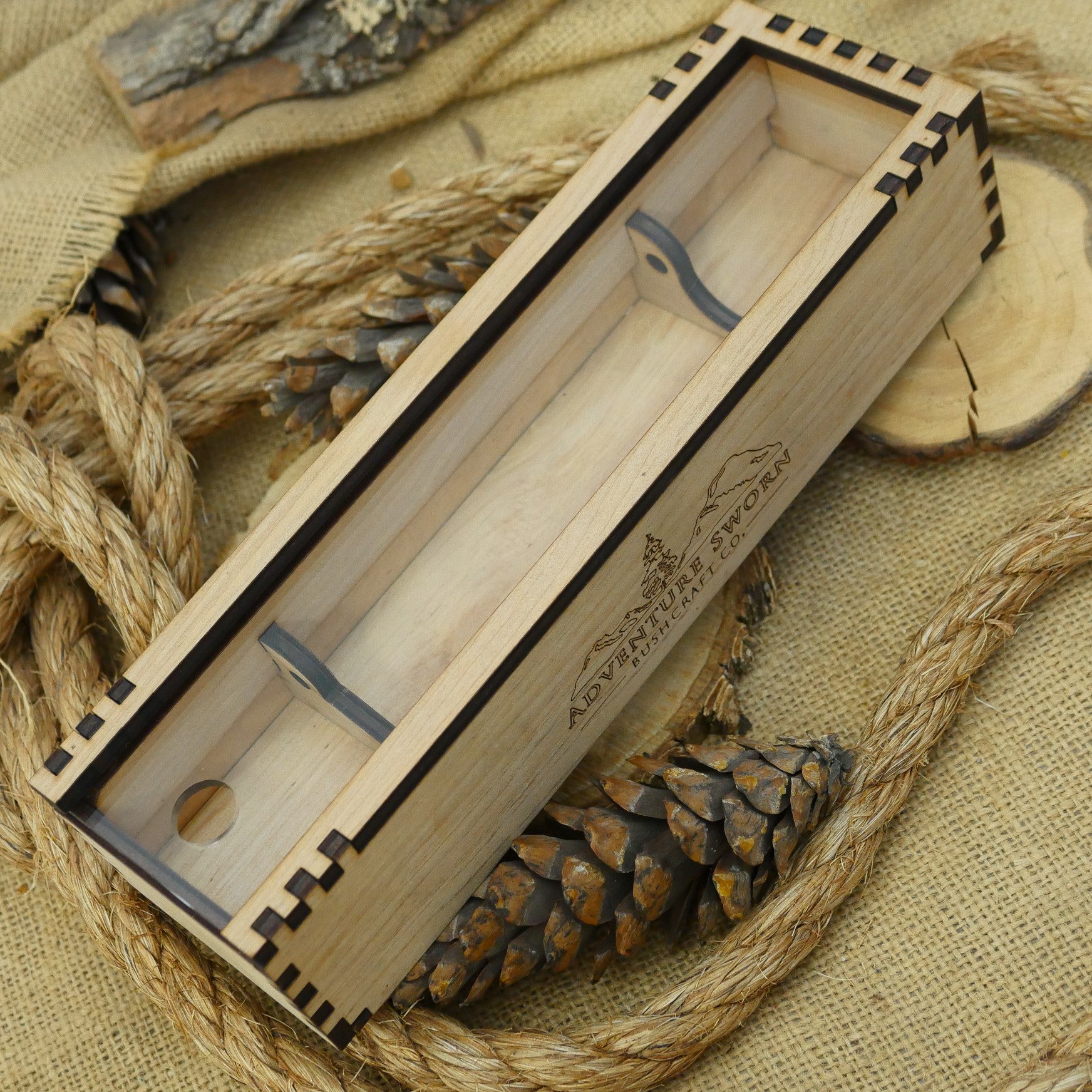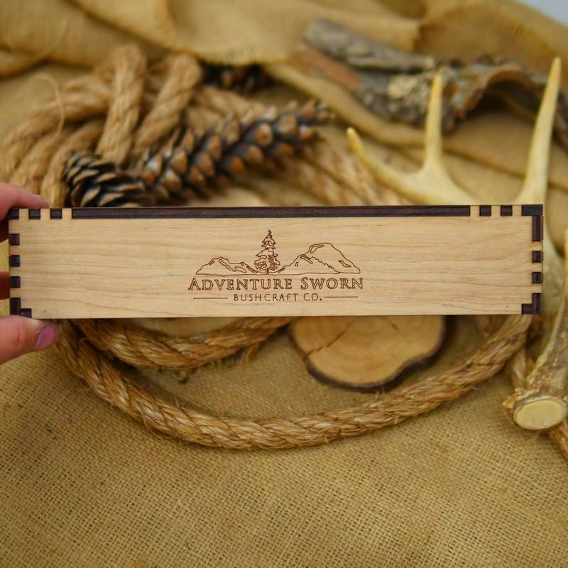 Currently these are offered in a maple laminate; yours may arrive darker in color (more like a mahogany). The box holds the knife in two positions; flat, or set at angle with the edge locked in. It has a clear plexiglass cover which slides out. The box is built with mortise & tenon joinery, wood glue, and nails. It features one of our "Adventure Sworn" mountain logo on one side of the box. Made in USA.