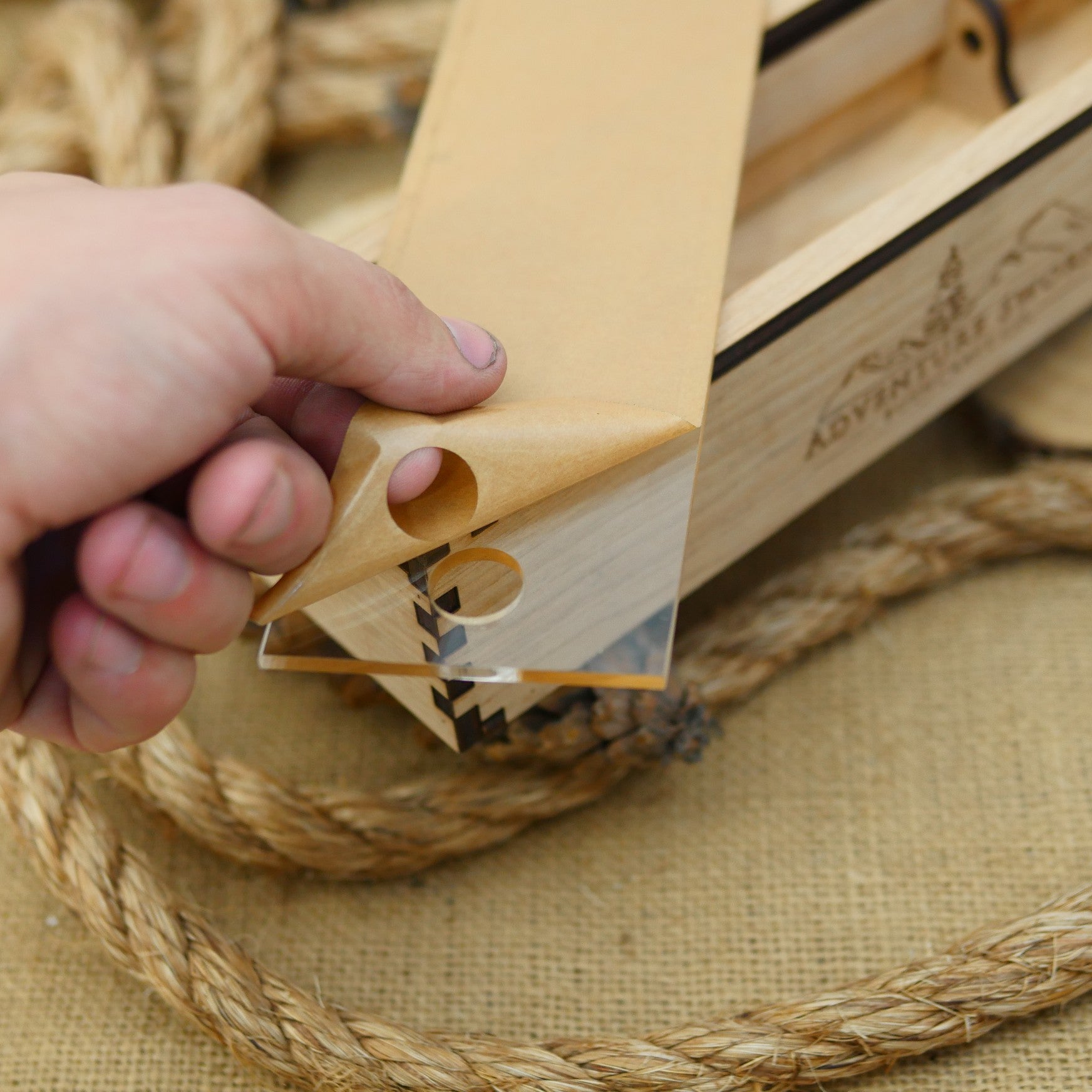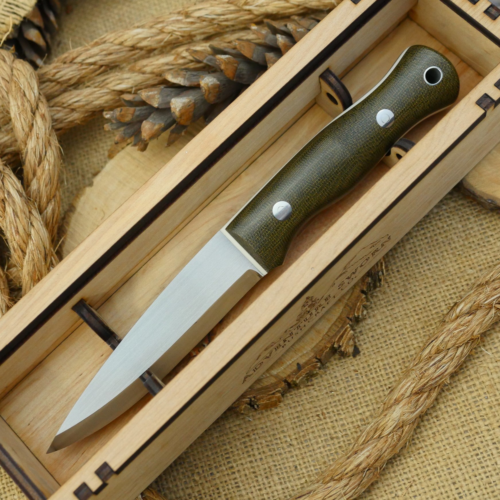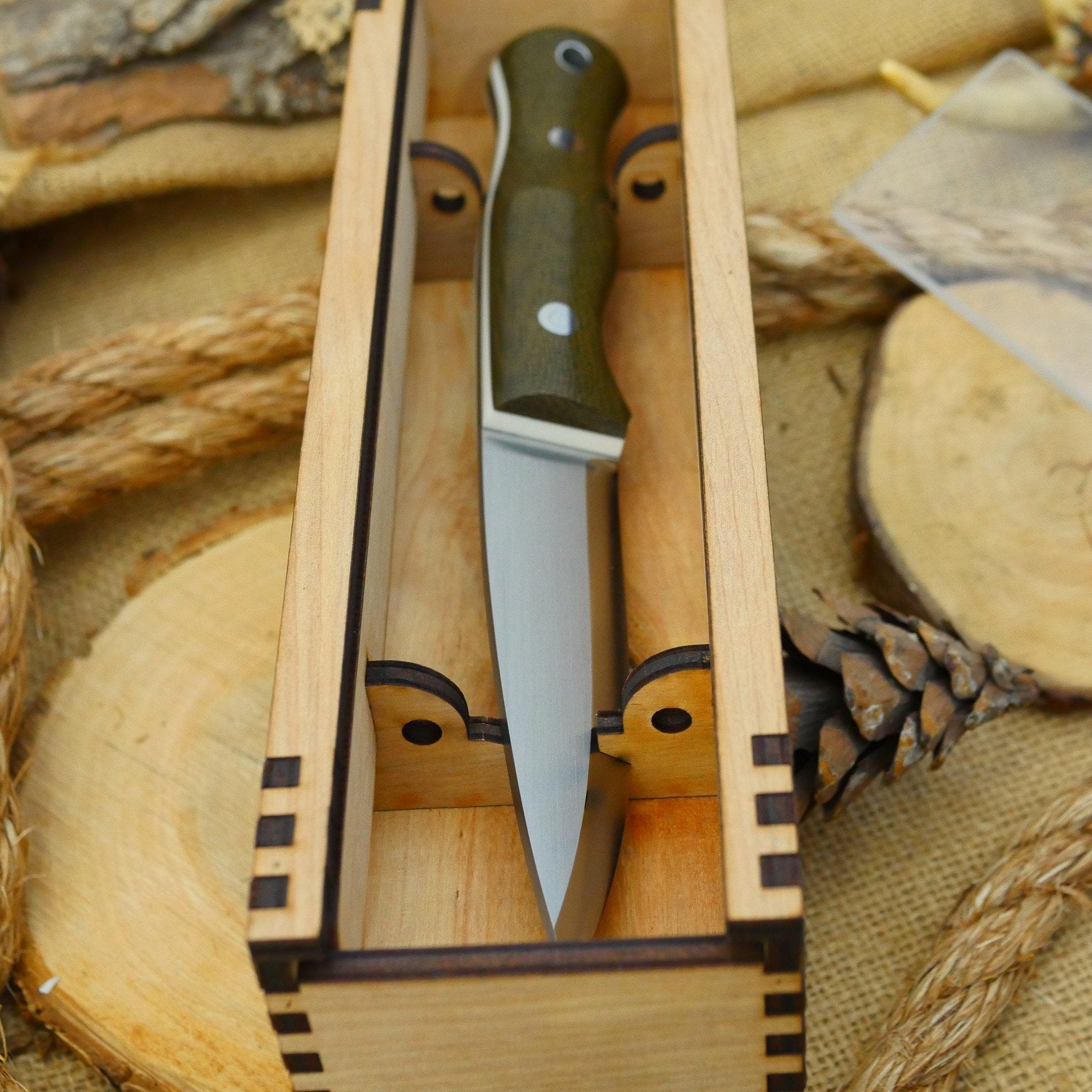 Currently these are offered in a maple laminate; yours may arrive darker in color (more like a mahogany). The box holds the knife in two positions; flat, or set at angle with the edge locked in. It has a clear plexiglass cover which slides out. The box is built with mortise & tenon joinery, wood glue, and nails. It features one of our "Adventure Sworn" mountain logo on one side of the box. Made in USA.