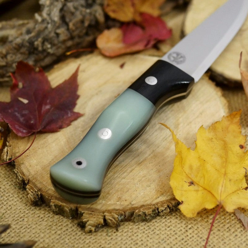 Handle: jade ghost g10, black canvas micarta bolster, black canvas micarta liners, stainless loveless bolts, stainless mosaic tube, extra thick contour